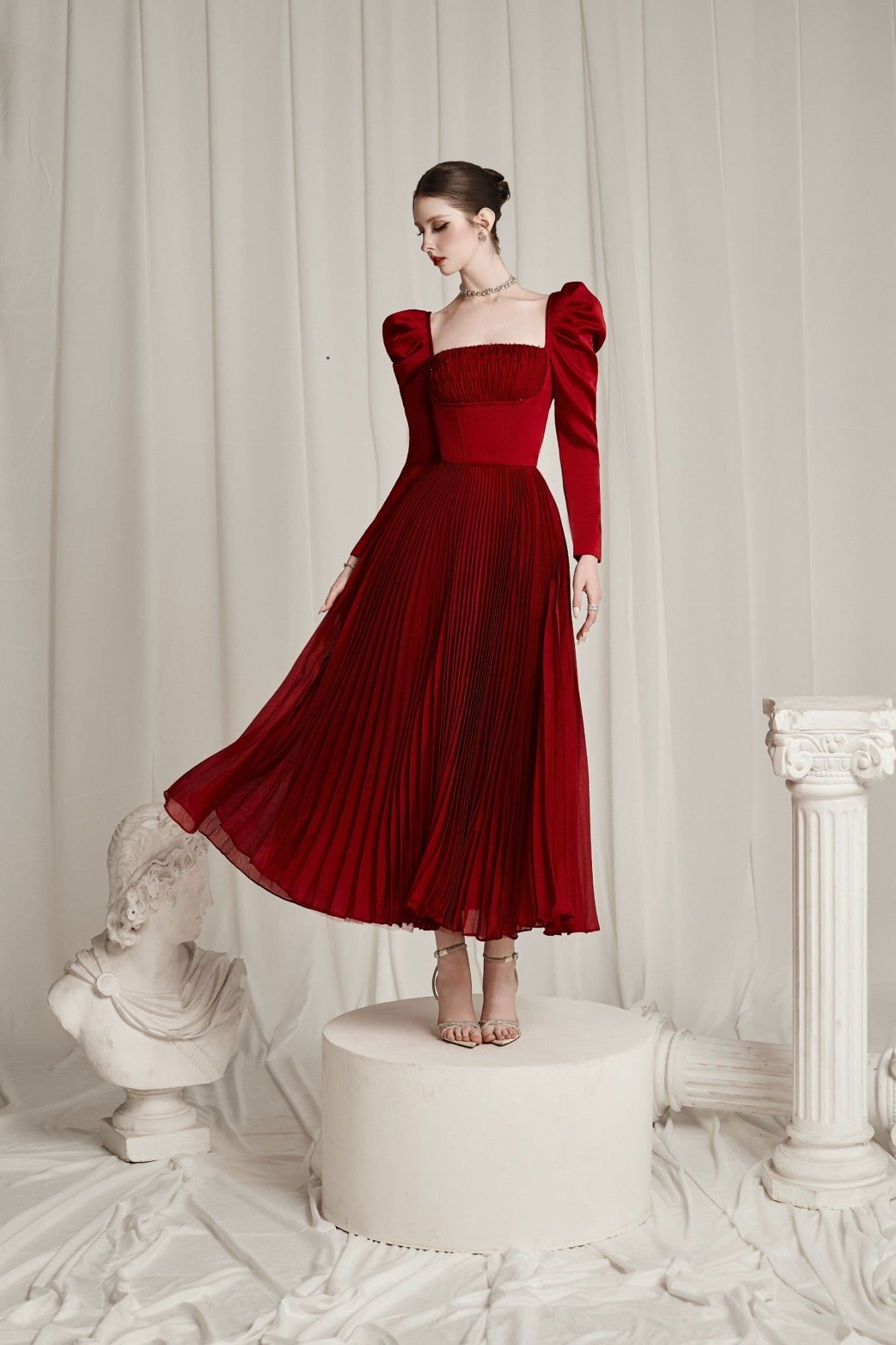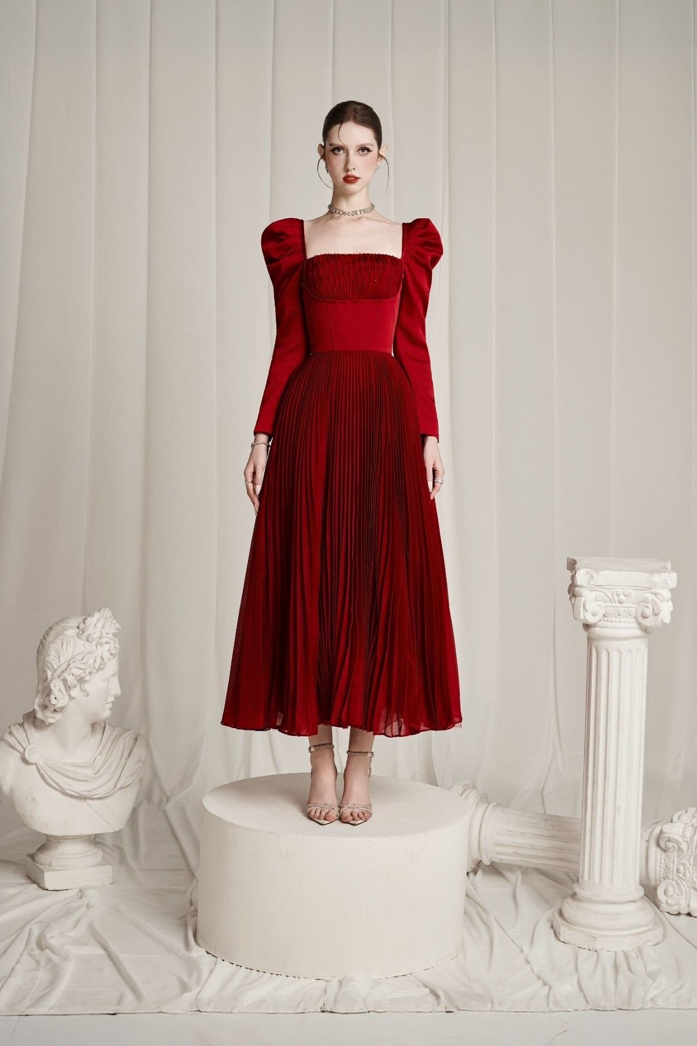 Aldéra Deep Red Corset Pleated Dress