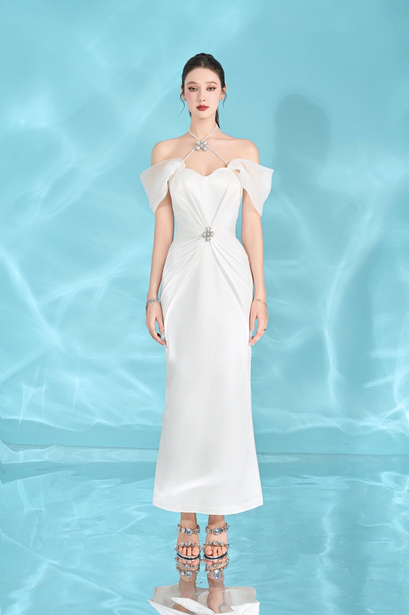 Cleverly tells a story about honoring sophistication and a liberal spirit, perfectly reflecting the elegant and dreamy beauty hidden within a lady, taking advantage of the butterfly arm folding technique to create the effect. The visual effect accentuates her slim figure.