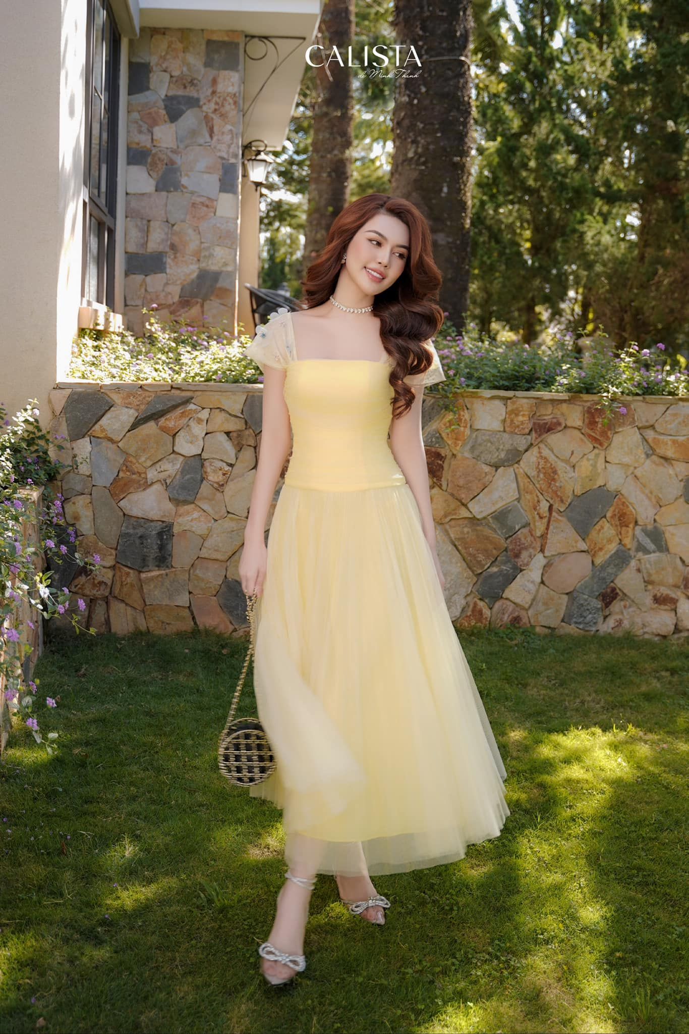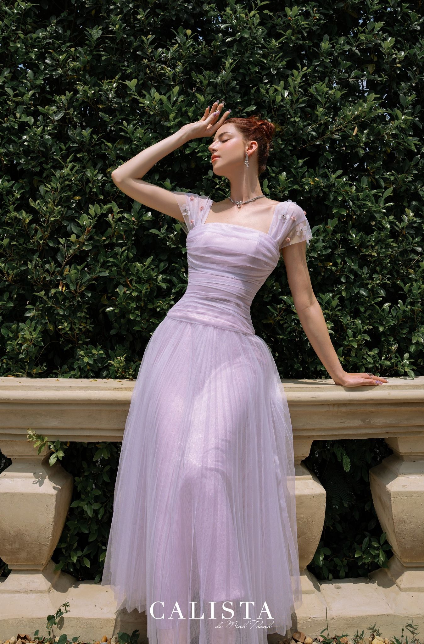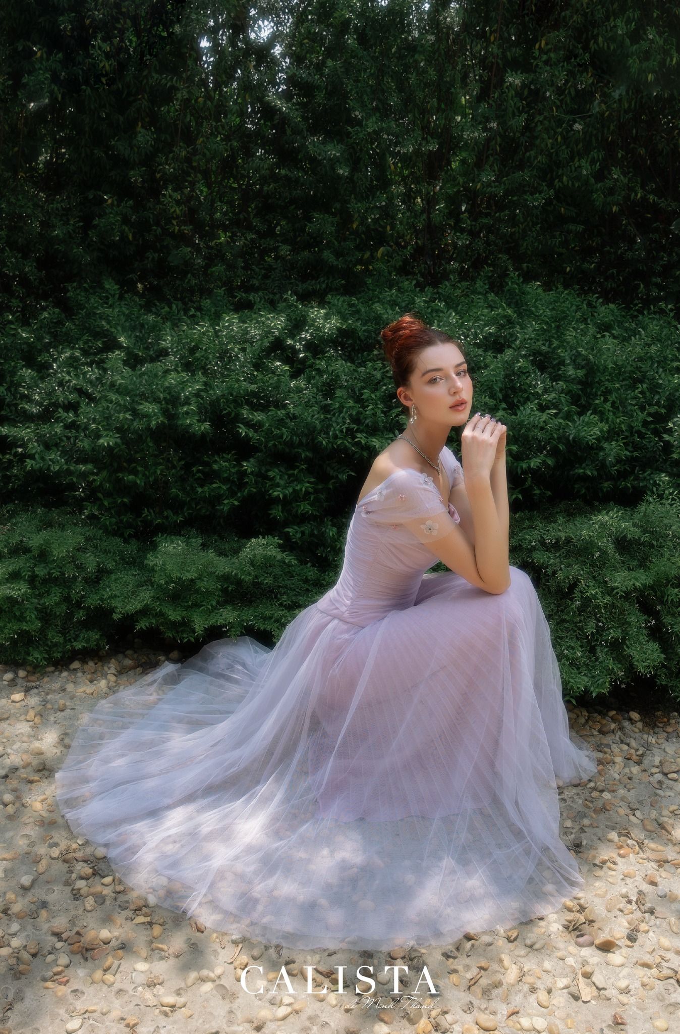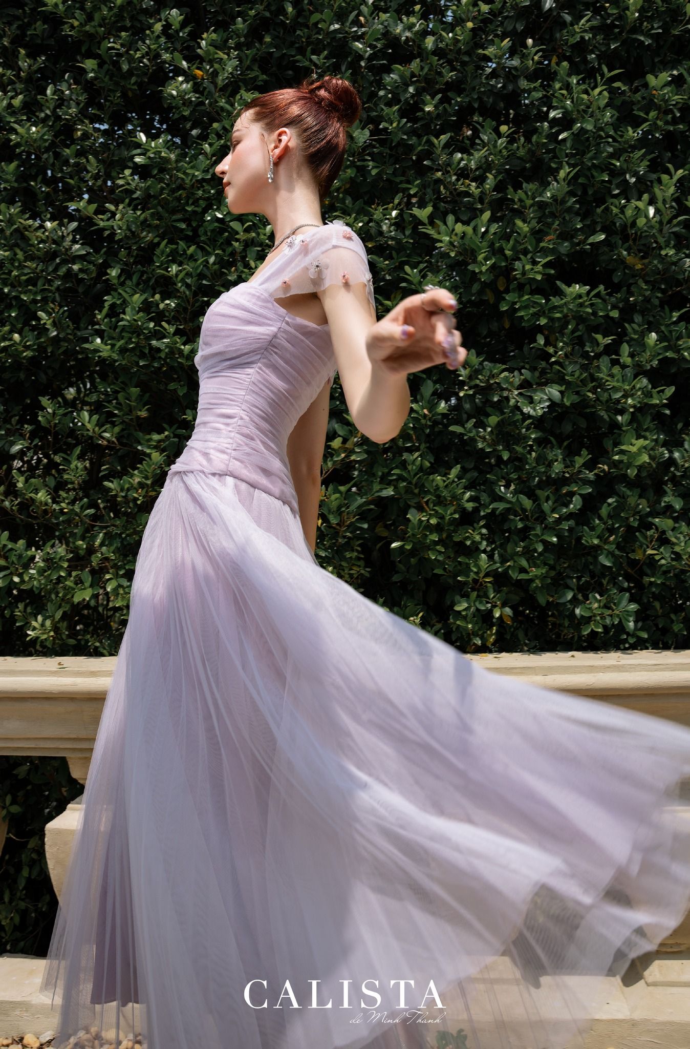 The tulle material makes the skirt more voluminous so that every movement is attractive. Calista also applies beading and flowering techniques to the arms and shoulders to bring more femininity and elegance.