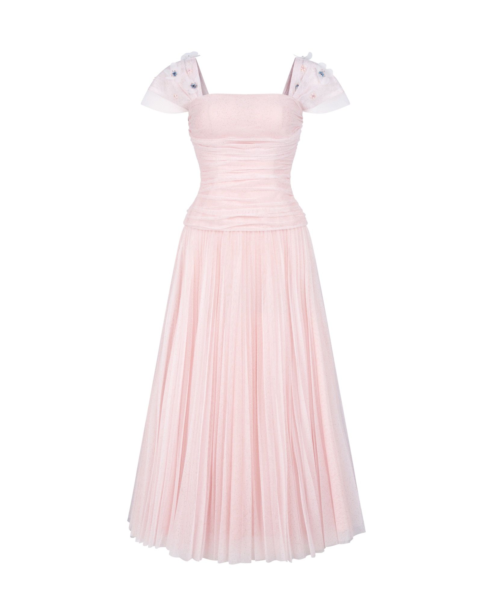 Angelic Haze Dress with a dreamy tulle fabric and a graceful long skirt with pleated stamping technique will accompany her into a romantic place.