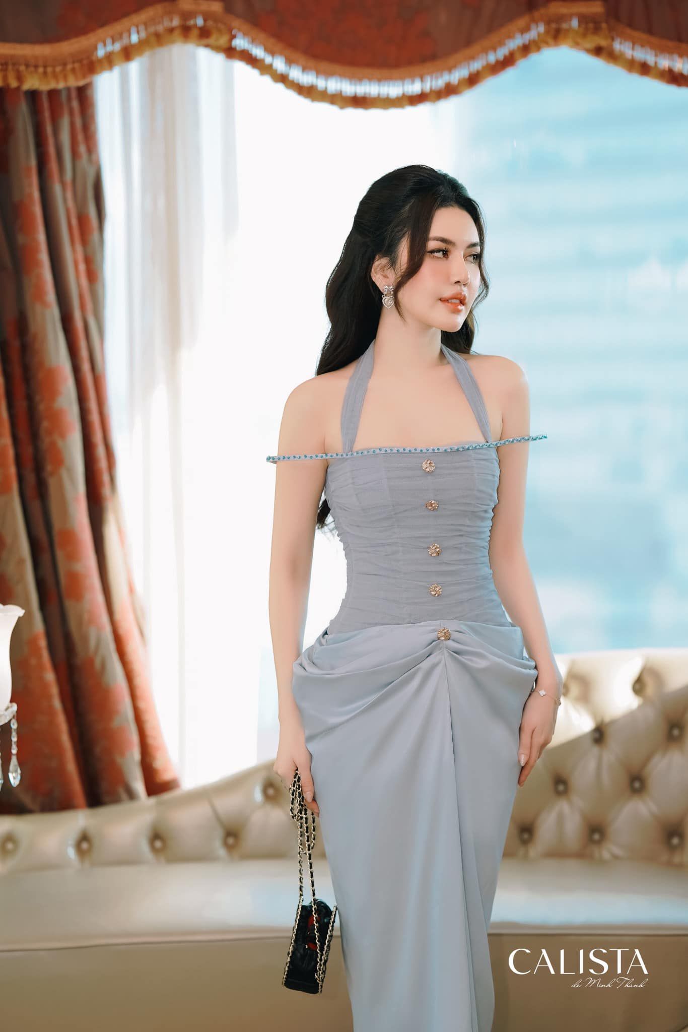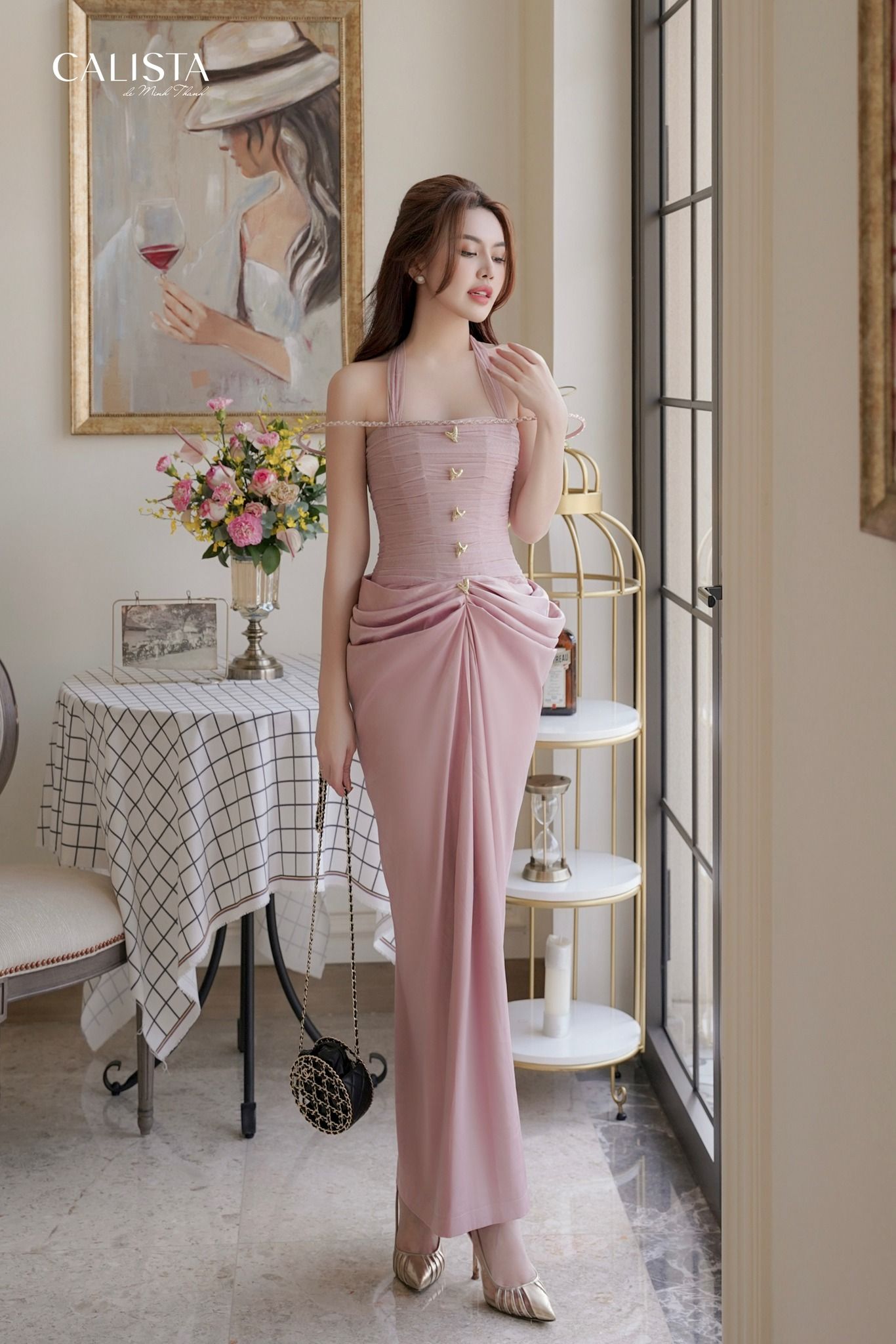 A gentle fishtail dress transformed to bring out more of a goddess's breath along with the draping technique on the upper body. Aphrodite Dress also pampers her frivolous dreams with meticulously attached details along the bodice, the regal gold-plated
