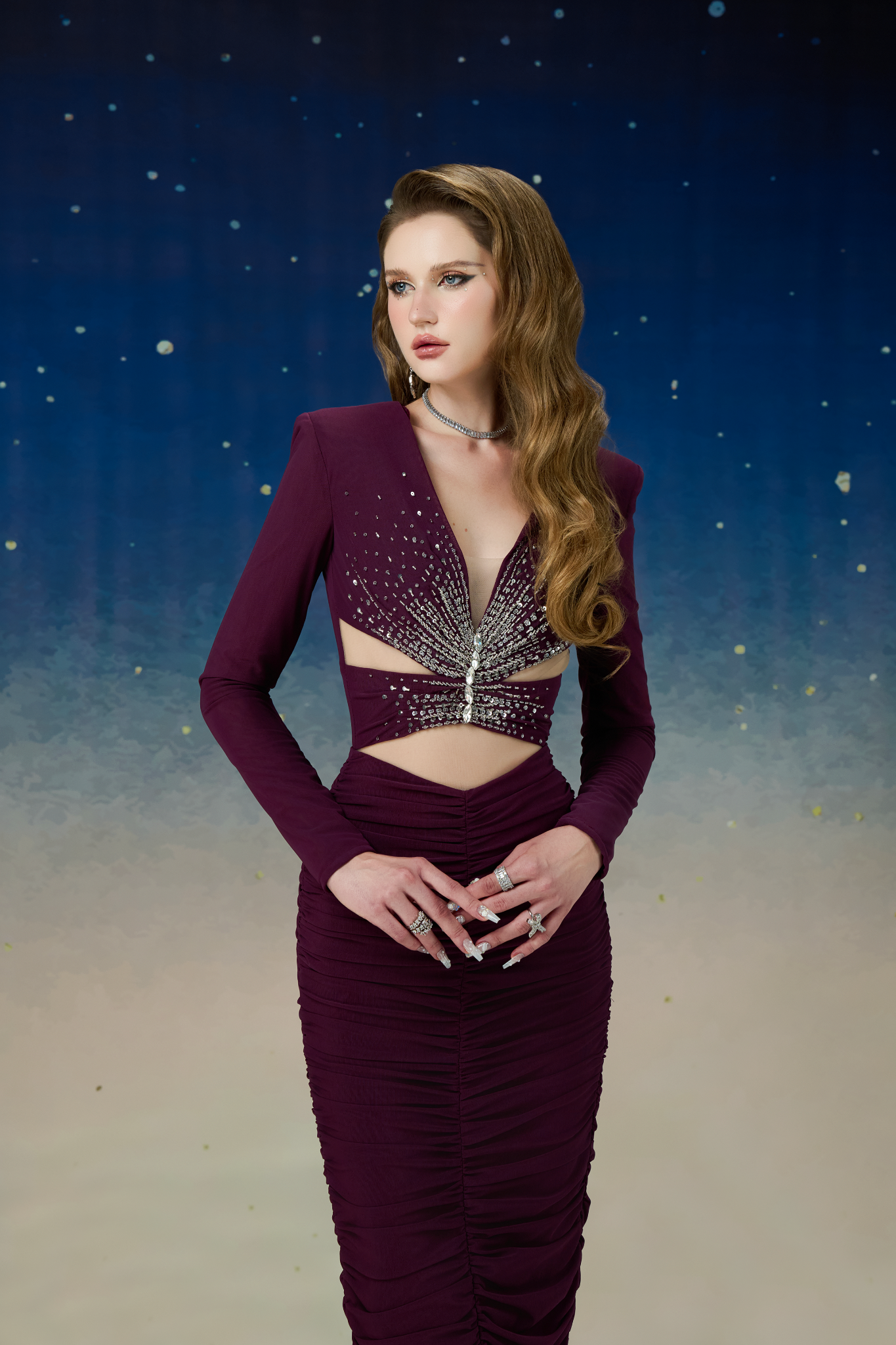 Details đính kết theo hình tia sáng của những vì sa.