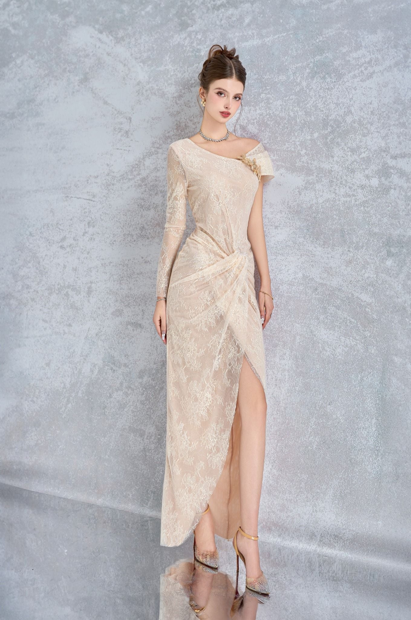 Calista khai thác phom dáng bất đối xứng; sử dụng đường cong tự nhiên theo cách mềm mại nhất. Dáng váy dạ hội đuôi cá với những biến tấu dịu dàng. Song hành là sự mới mẻ trong gam màu “earth tone” dịu mắt, nhuộm trên chất liệu ren mi và Dreamy Tulle mơ mộng đậm sắc thái mùa hè.