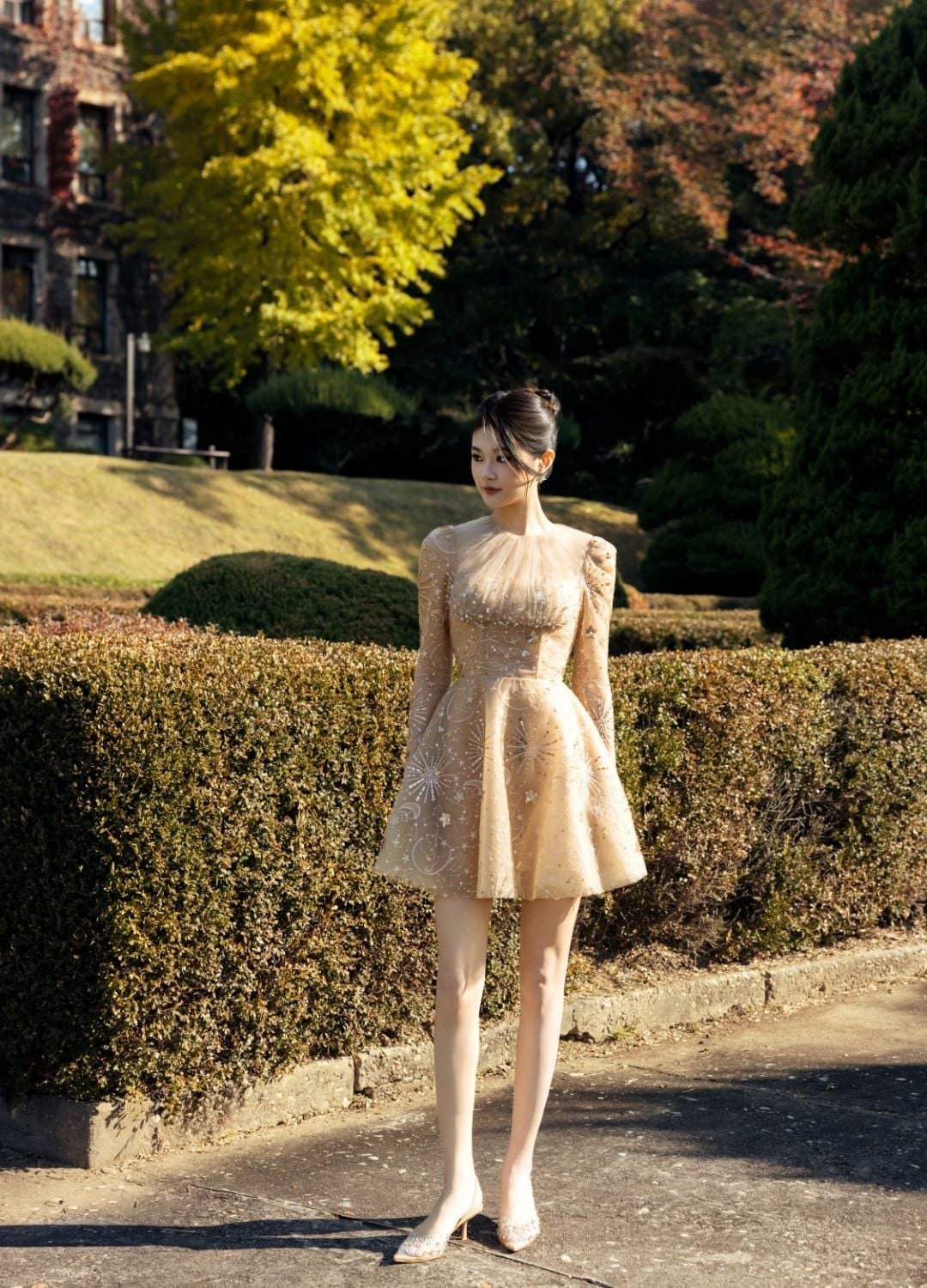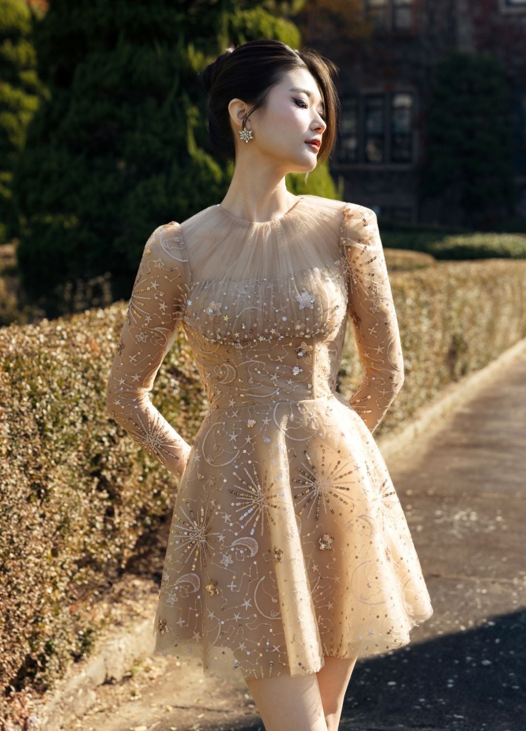 Description: A youthful, fluttering short dress with slight puff sleeves. The collar is draped and lightly embellished to create sparkle. The sheer fabric features detailed Star/Moon appliqué/embellishment. The nude-bronze tone creates a warm, brilliant, and radiant feel.