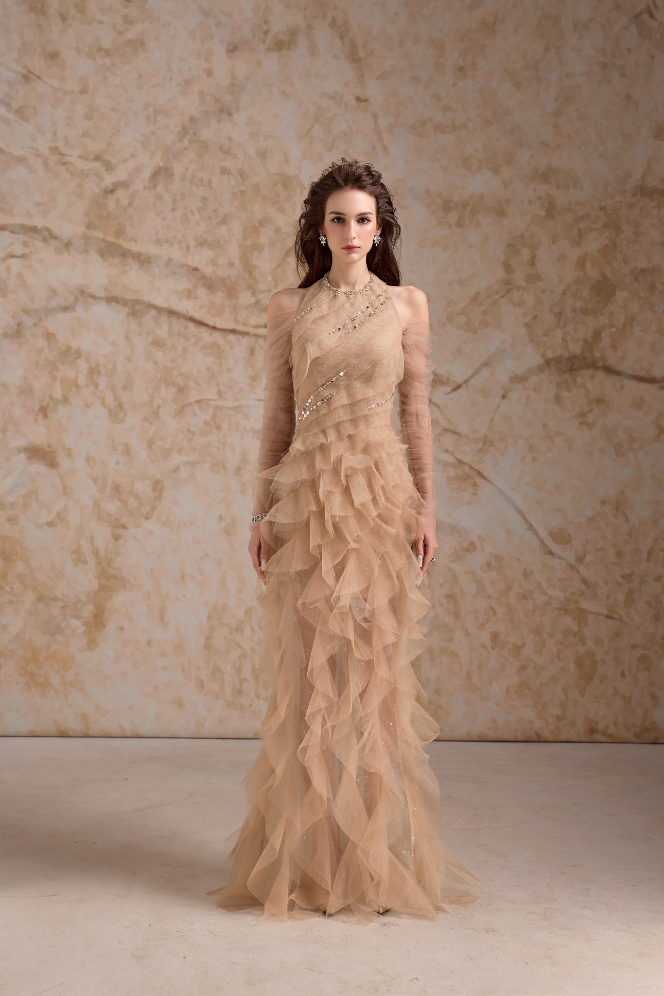 Dáng váy dạ hội dài, ôm trọn đường cong đẹp đẽ dễ dàng trở thành tâm điểm với kỹ thuật xếp layer, phối trộn nhiều tầng vải tulle mong manh, lấp lánh.