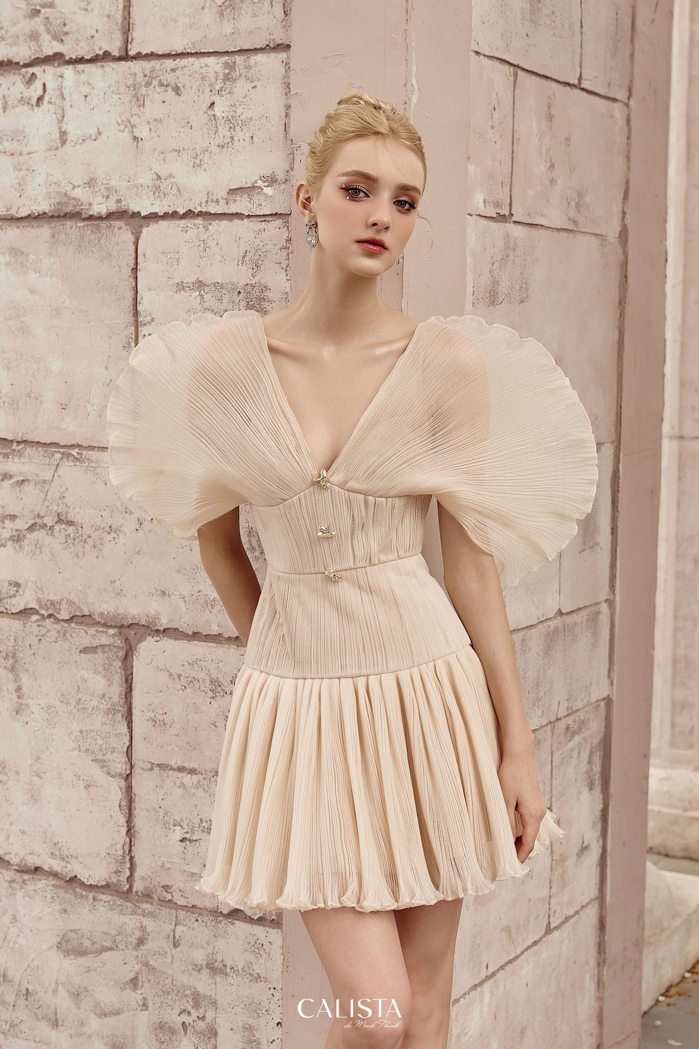 With the chiffon material and pleated technique, meticulously attached button details are added to fully hug and accentuate the small waist.