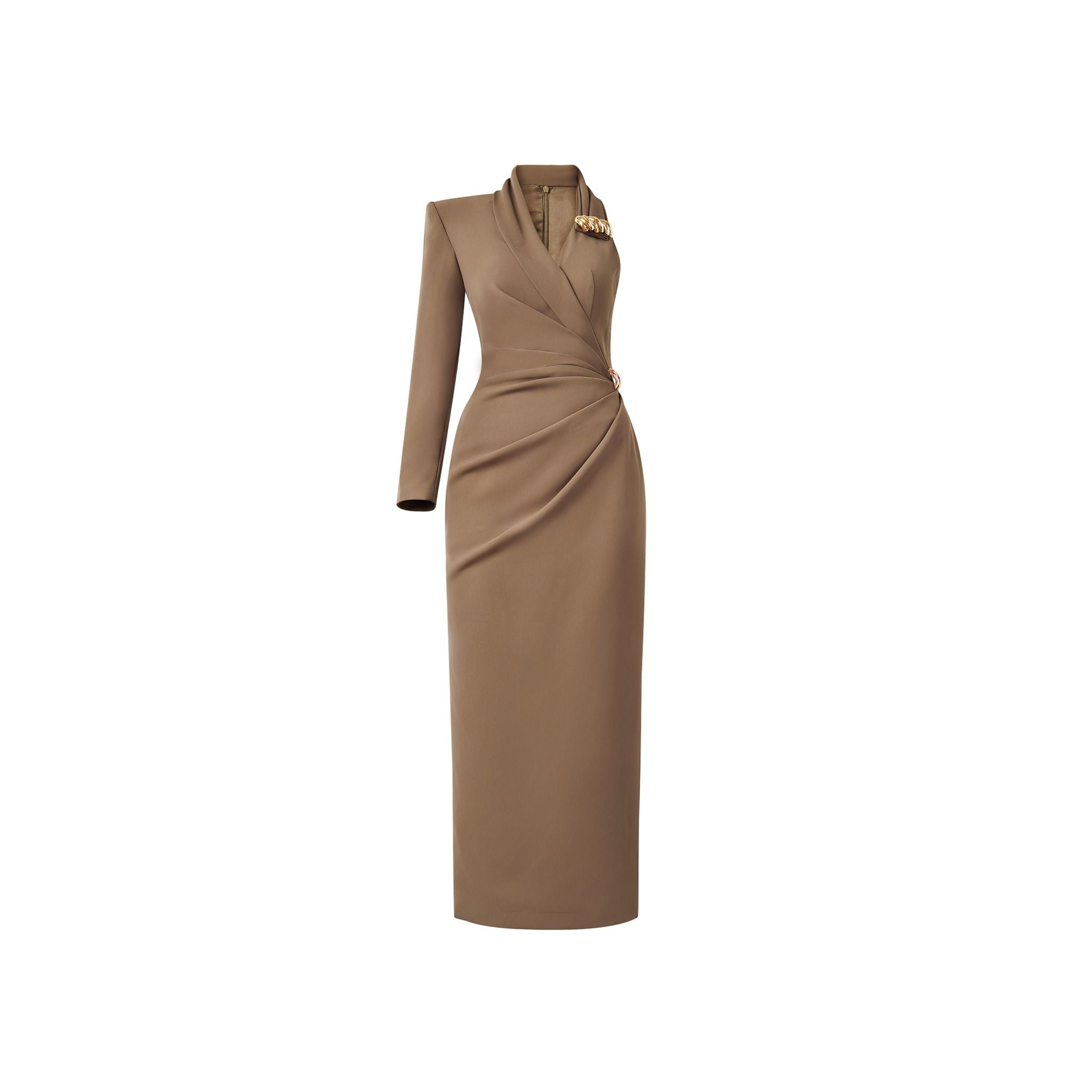 Đầm vest thiết kế lệch vai hiện đại, có xẻ tà sau dễ di chuyển.