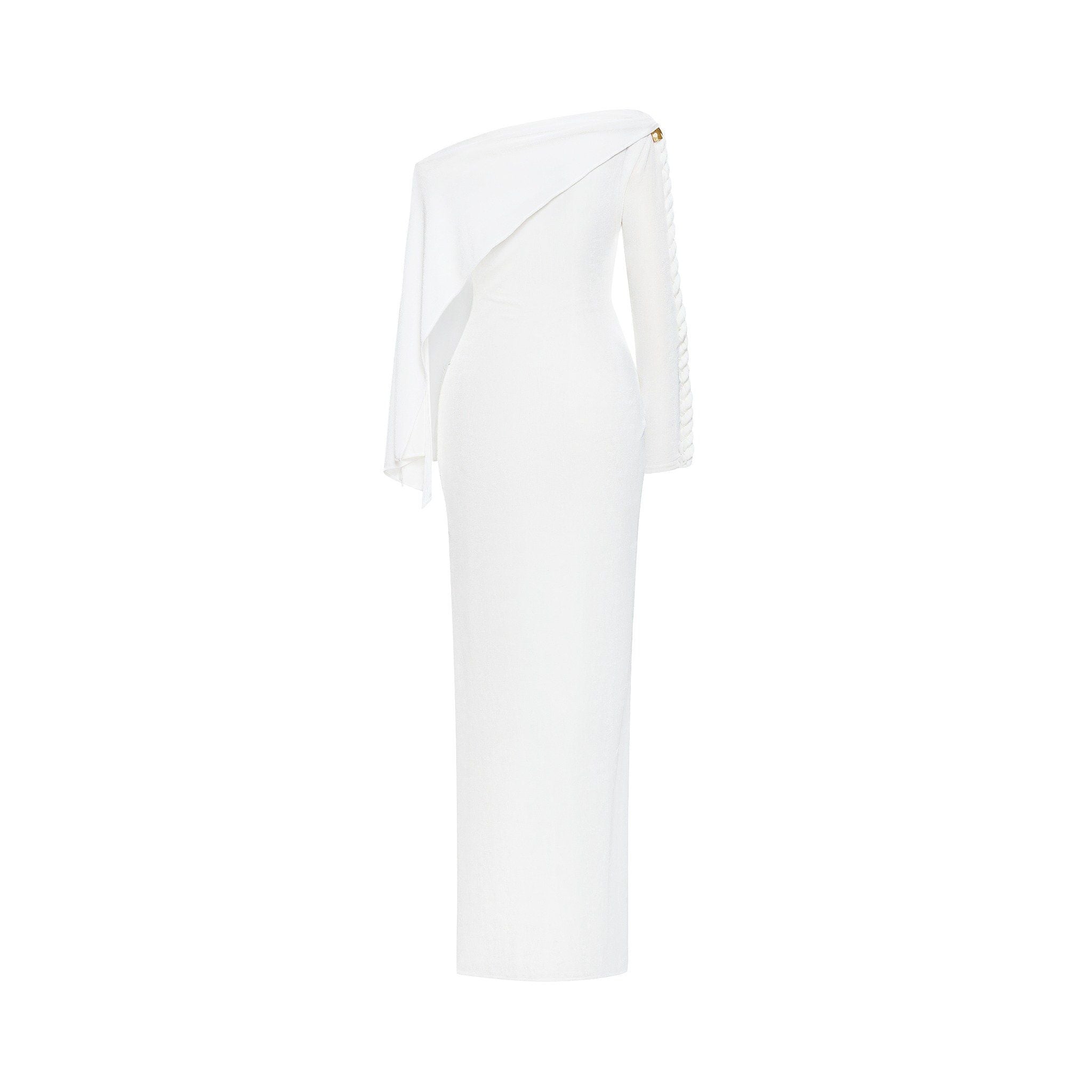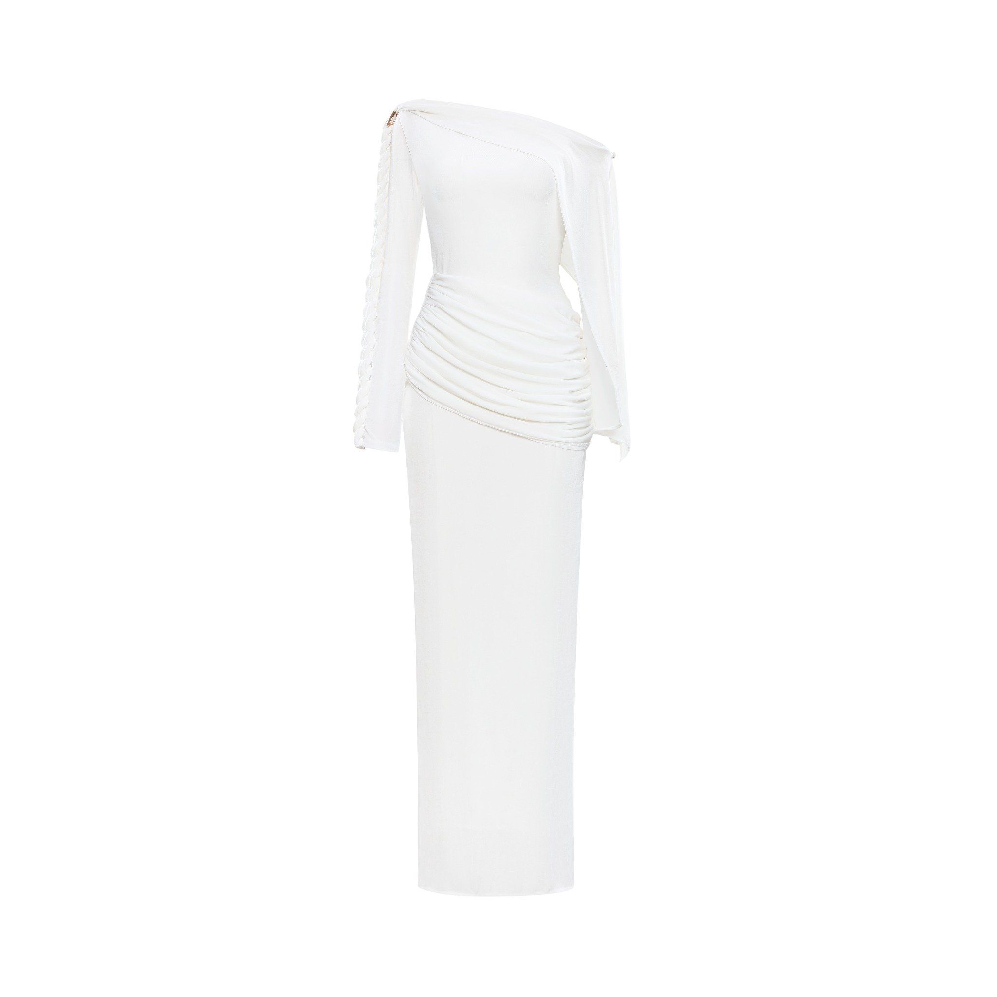 An off-shoulder fitted gown with twisted strap detail and gold charm accents, offering timeless elegance for formal occasions.