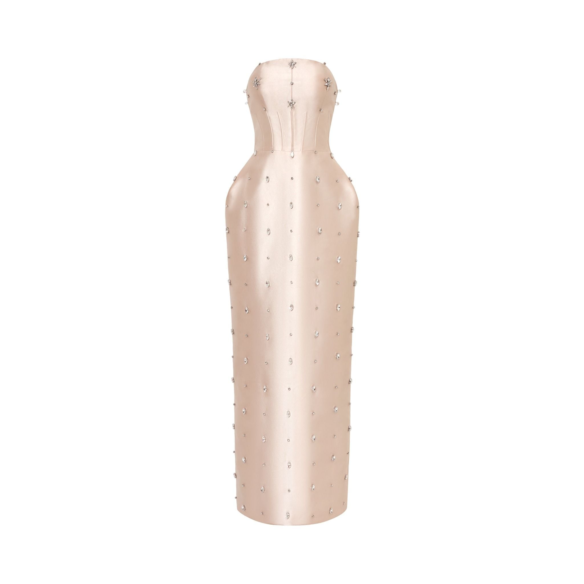 Form đầm cúp bút chì xẻ tà thân sau giúp tôn dáng người mặc, phối gọng corset thân trên tạo điểm nhấn eo