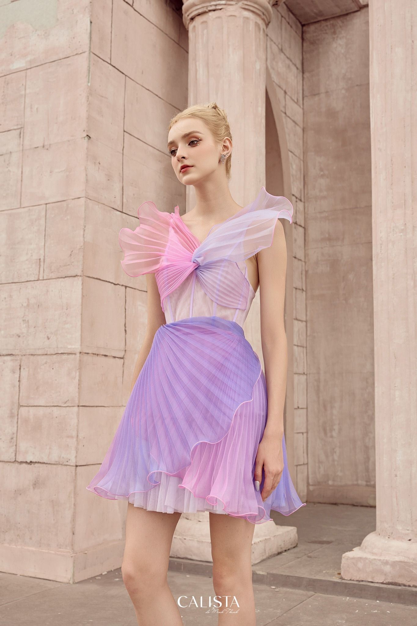 Euterpe dress is designed with foam silk material combined with the digital printing technique. The colors printed on the fabric depict