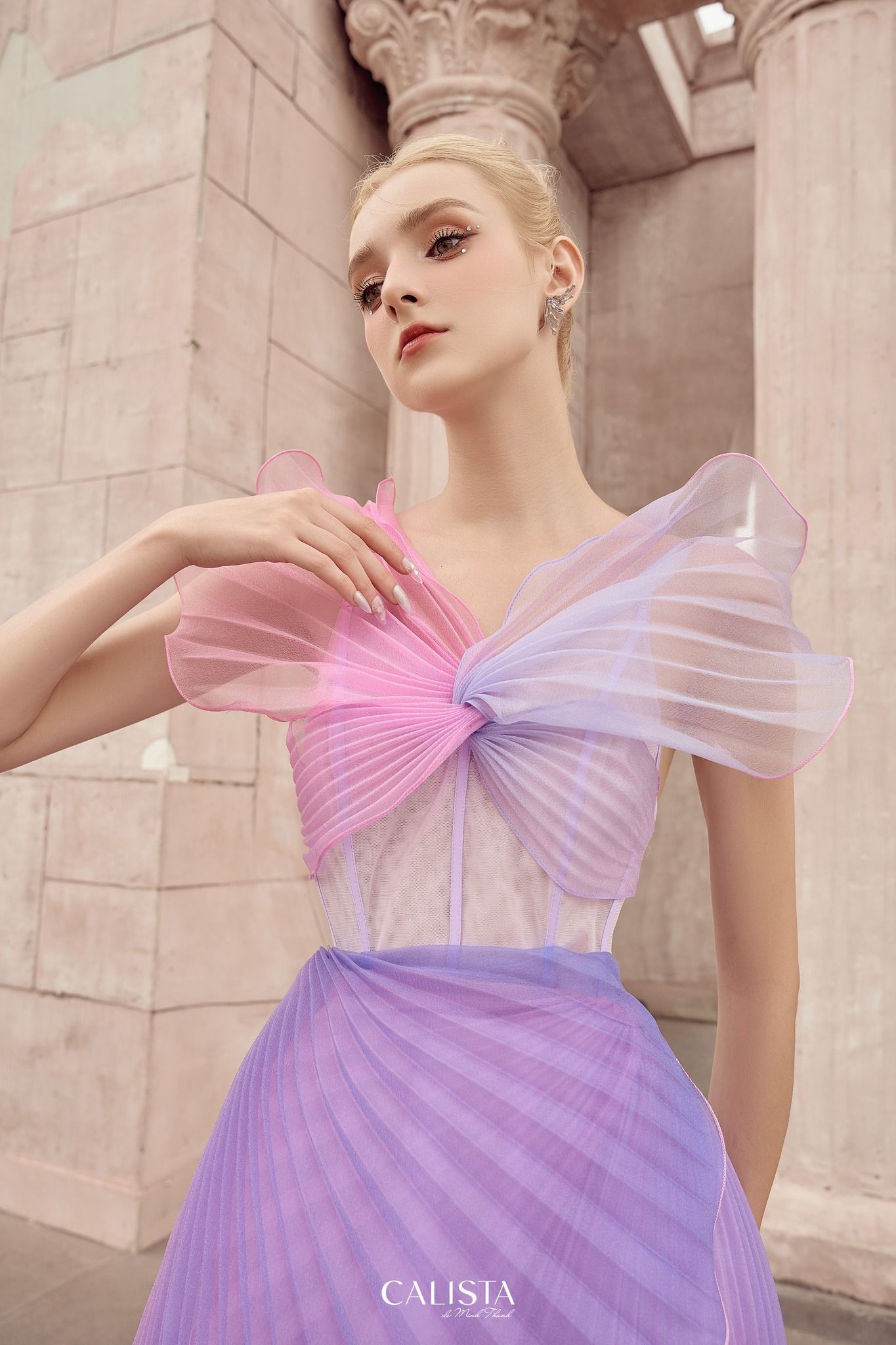The neck is gently twisted in the center to create a bow that stretches to the chest, and the dreamy fairy-wing sleeve design just hides the flaws in the biceps. but still retains the spirit of innocence and purity.