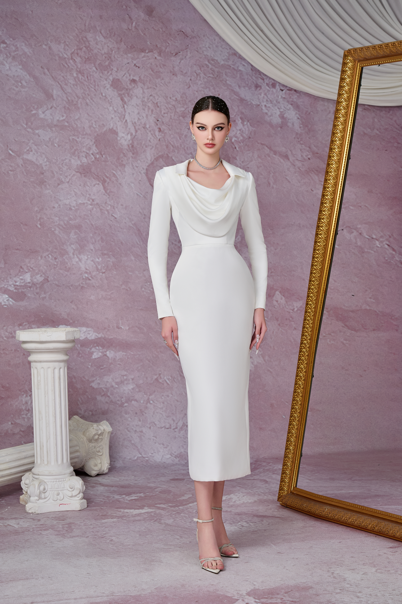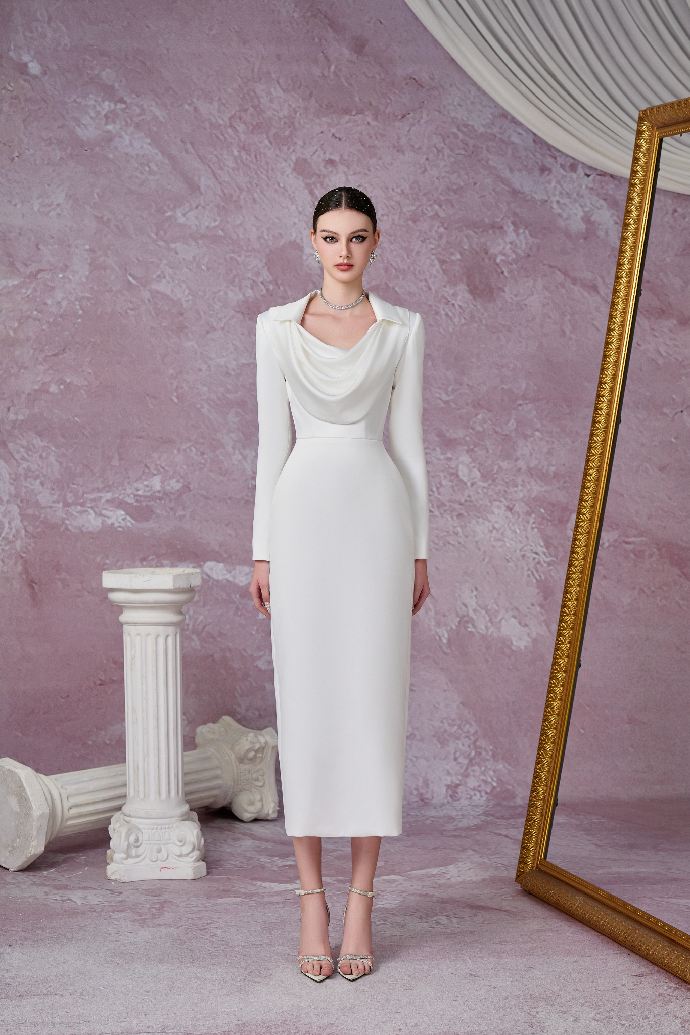 Đầm vest với thiết kế cổ rộng và đổ xuống tạo nên nét quyến rũ và nữ tính cho người mặc.