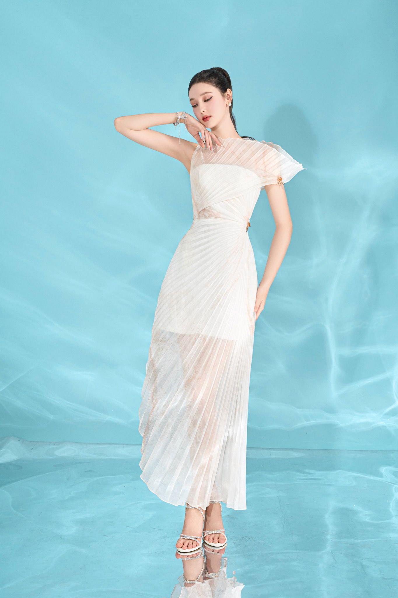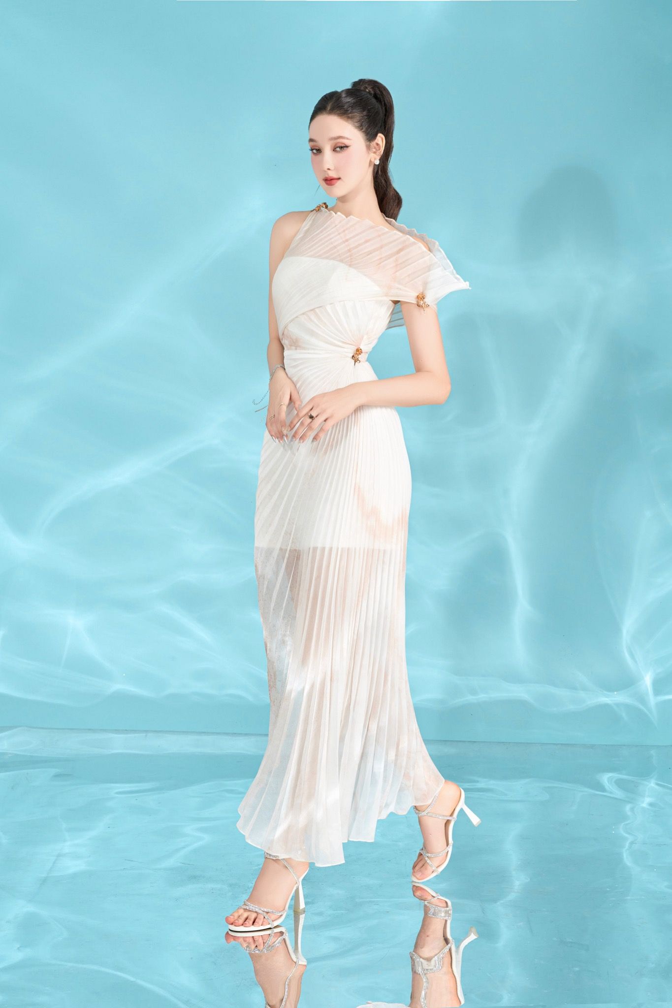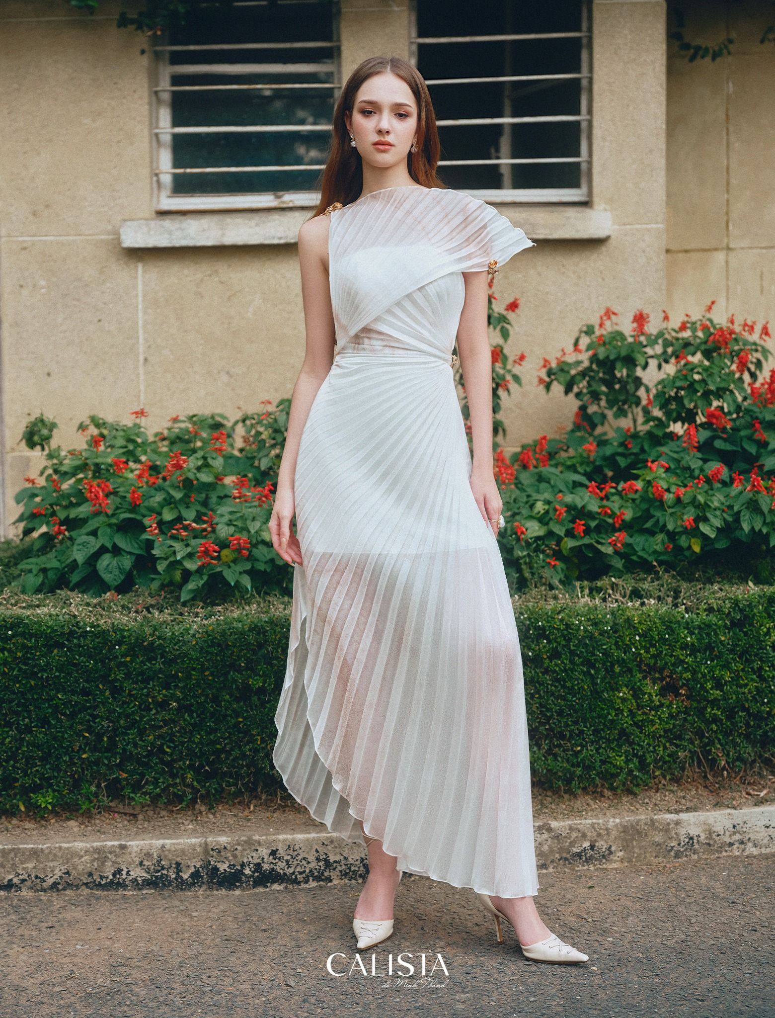 Immerse yourself in the wanderlust of regal Twill fabrics that create a multi-layered structure with a sophisticated asymmetric cross fan cup stamping technique throughout the design like a giant blooming calyx with bold artistic creativity. creating a feeling of full vitality.