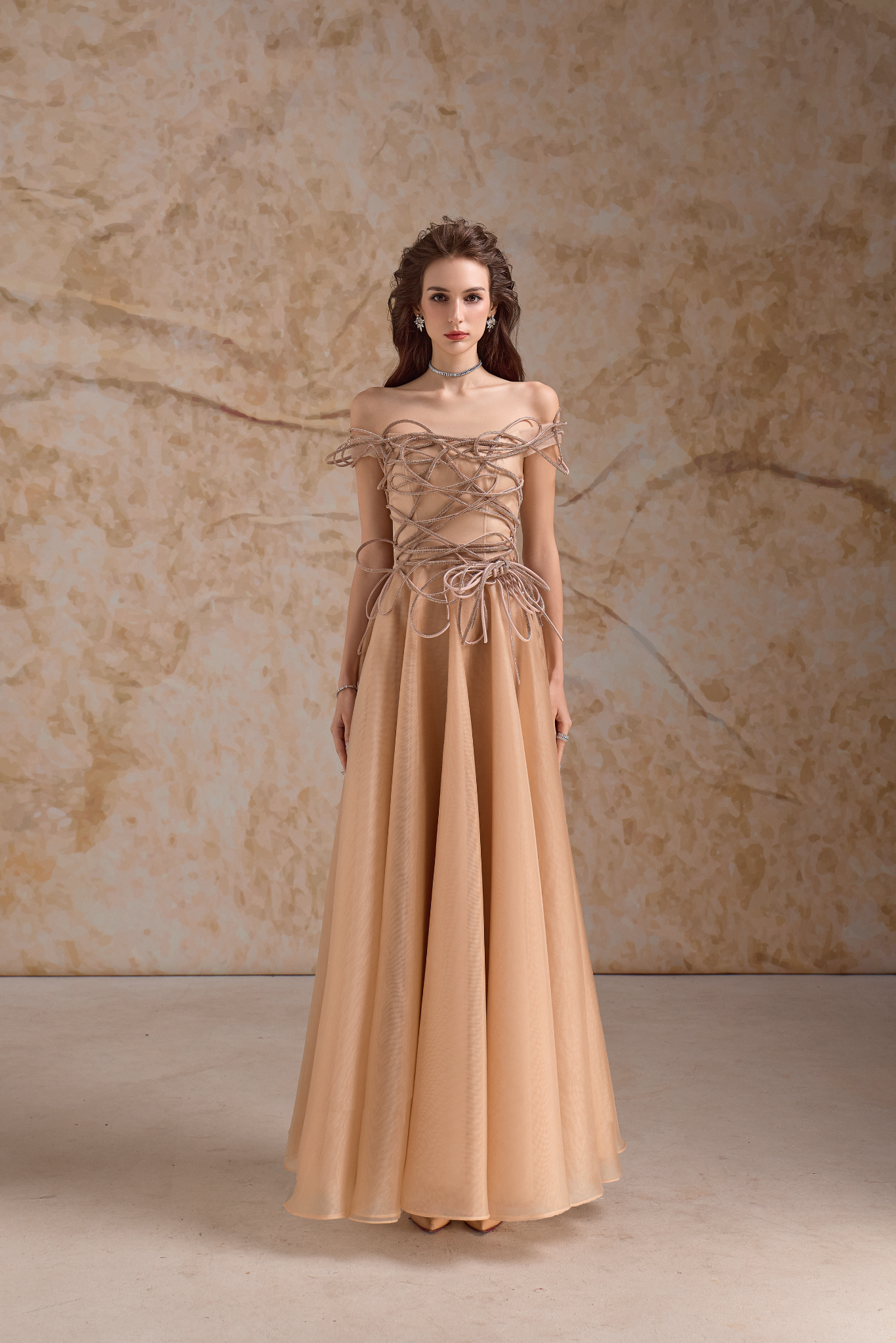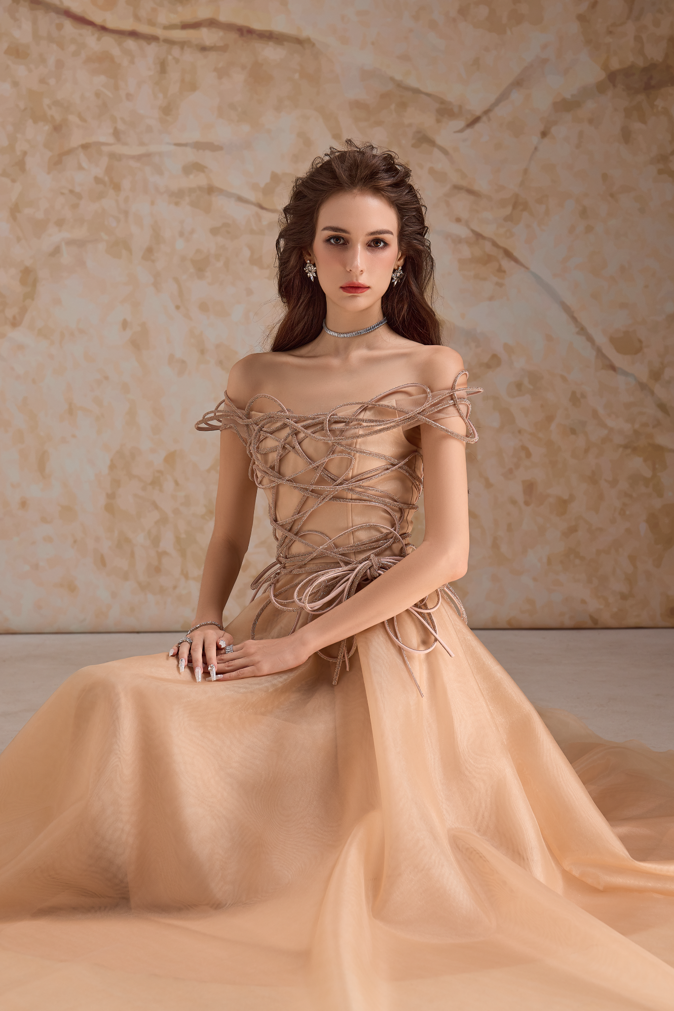 Dáng đầm dạ hội ngang vai với những đường nét mềm mại, tôn vinh bờ vai ngọc ngà. Dải dây lấp lánh bởi đính kết tỉ mỉ hàng nghìn viên đá nhỏ uốn lượn với dáng vẻ trừu tượng tạo nên một hiệu ứng thị giác mê hoặc.