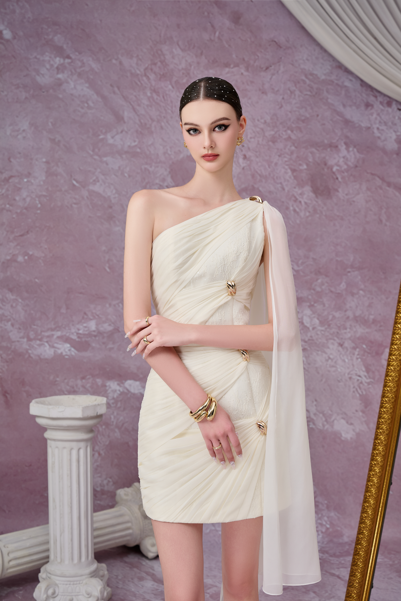 Đầm lệch vai, 1 bên vai có tà bay tạo sự khác biệt. Điểm nhấn nằm ở phần xếp ly tay bắt canh thủ công tỉ mỉ, đính kèm phụ kiện bắt mắt.
