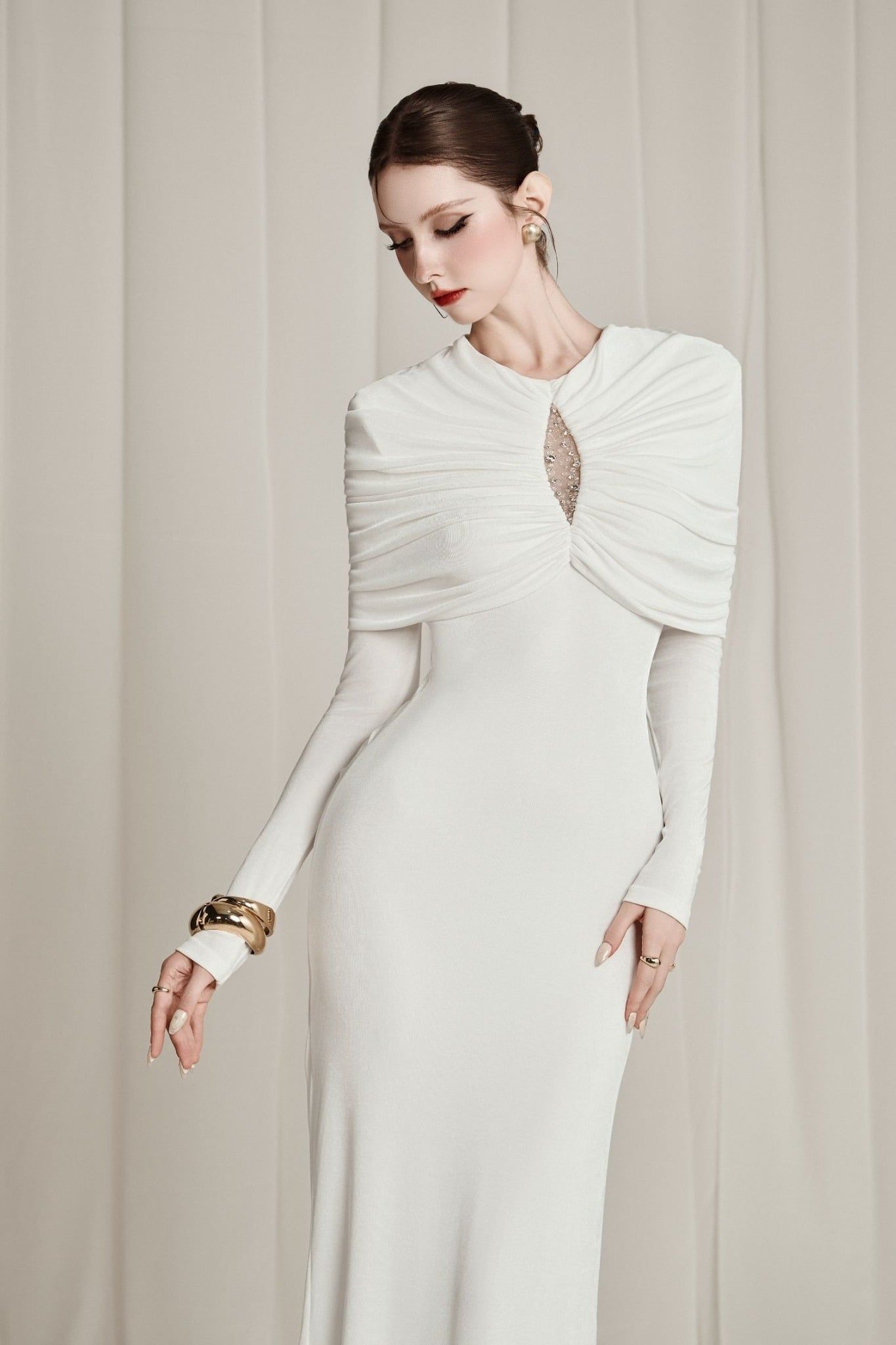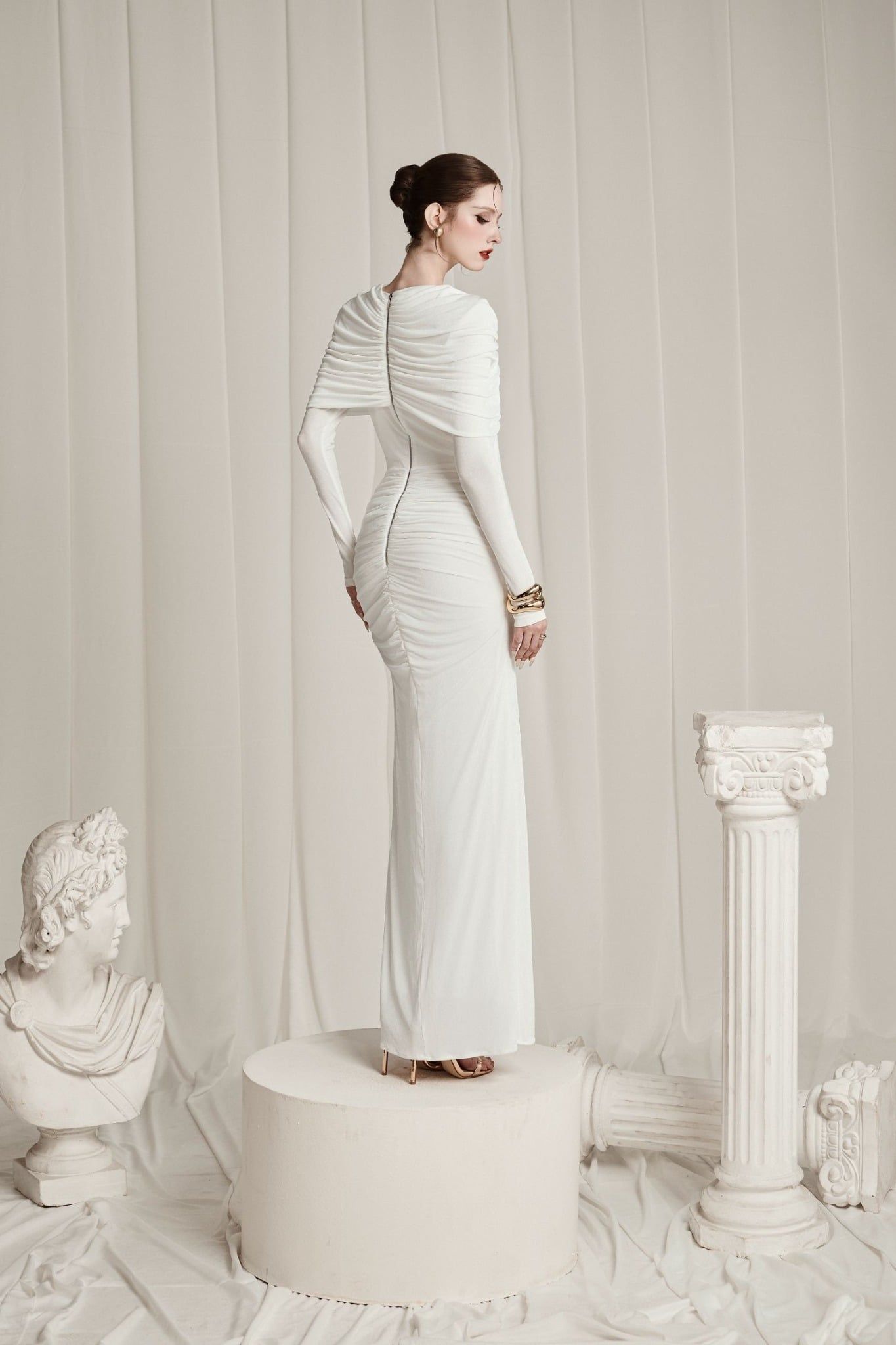 | Skirt: Form-fitting midi skirt with fluid draping lines | |