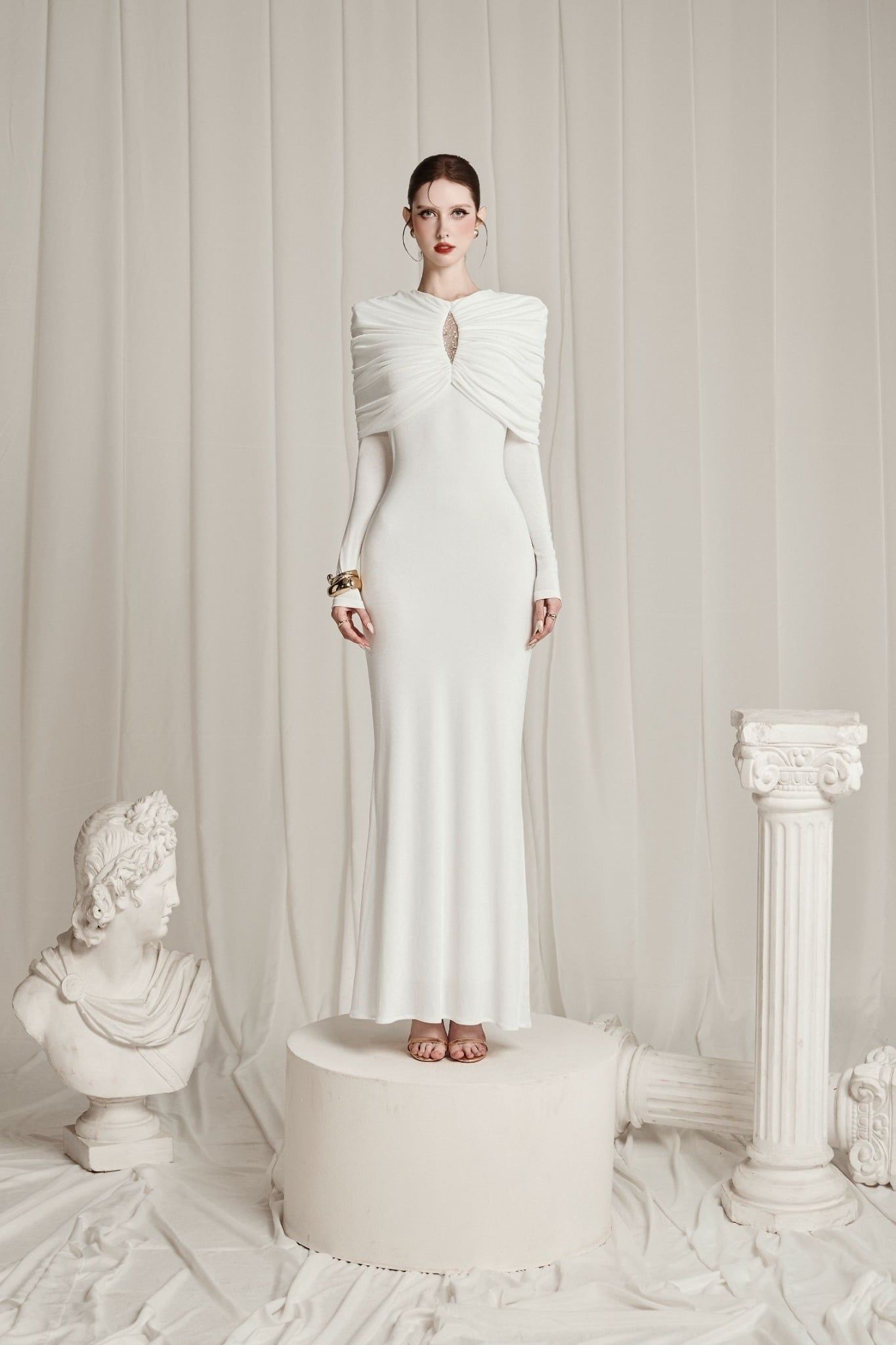 | Neckline: High neckline (Cổ sát) with elegant gathered detailing | |
