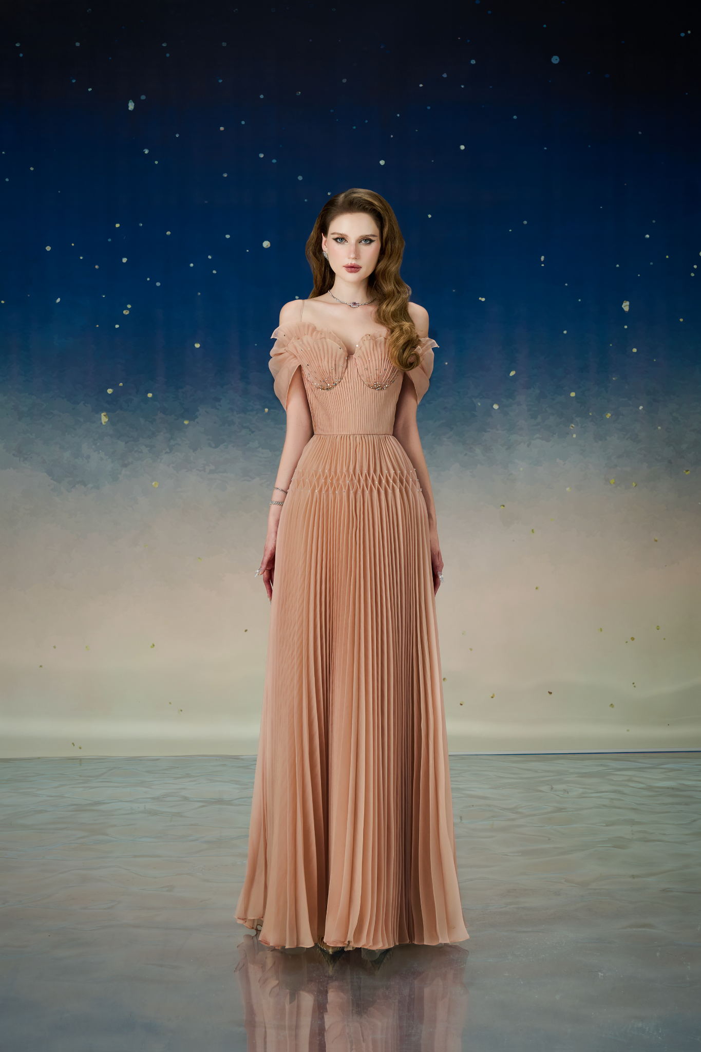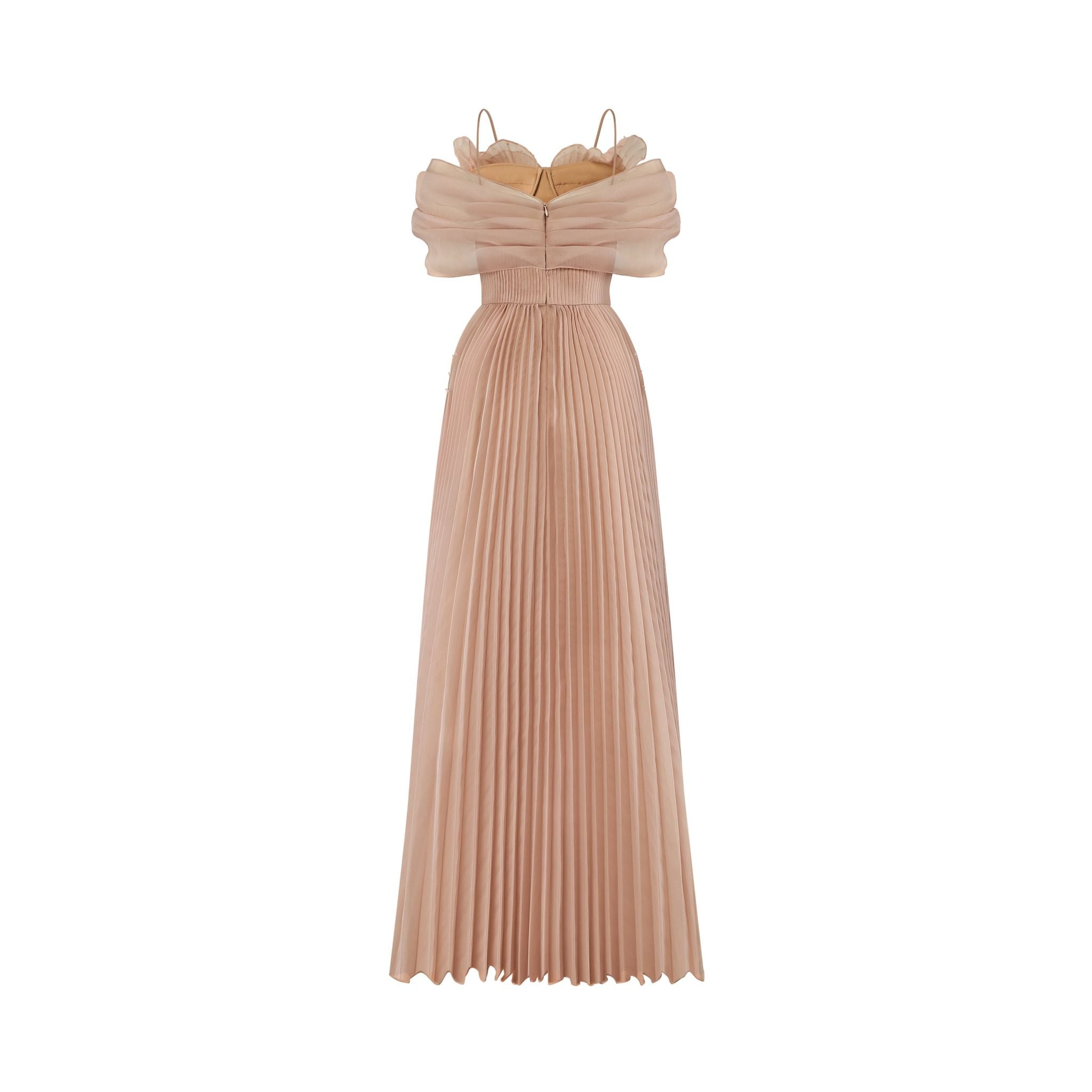 Chất liệu: Organza cao cấp được dập li thủ công. Phần cup ngực xếp layer thu hút ánh nhìn.