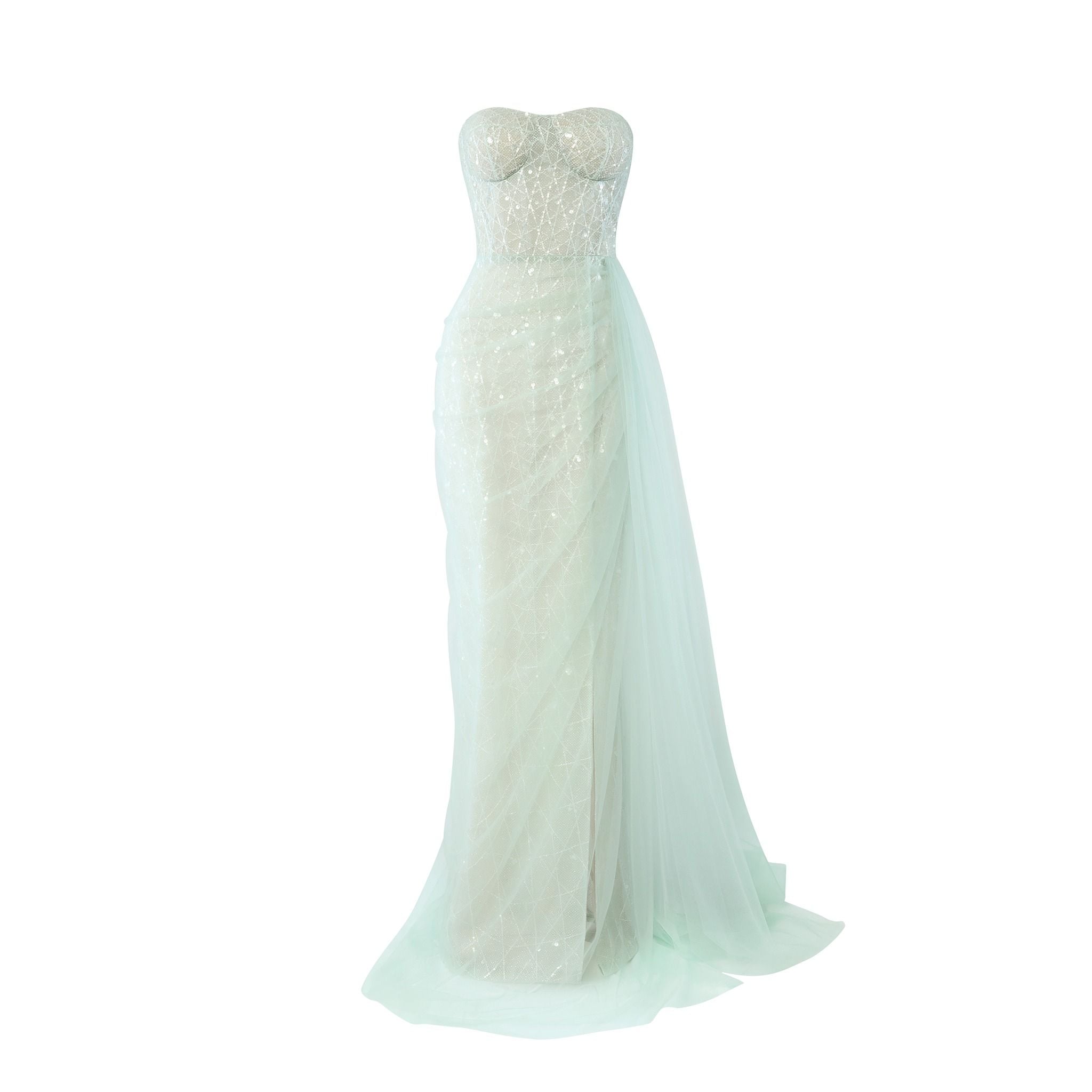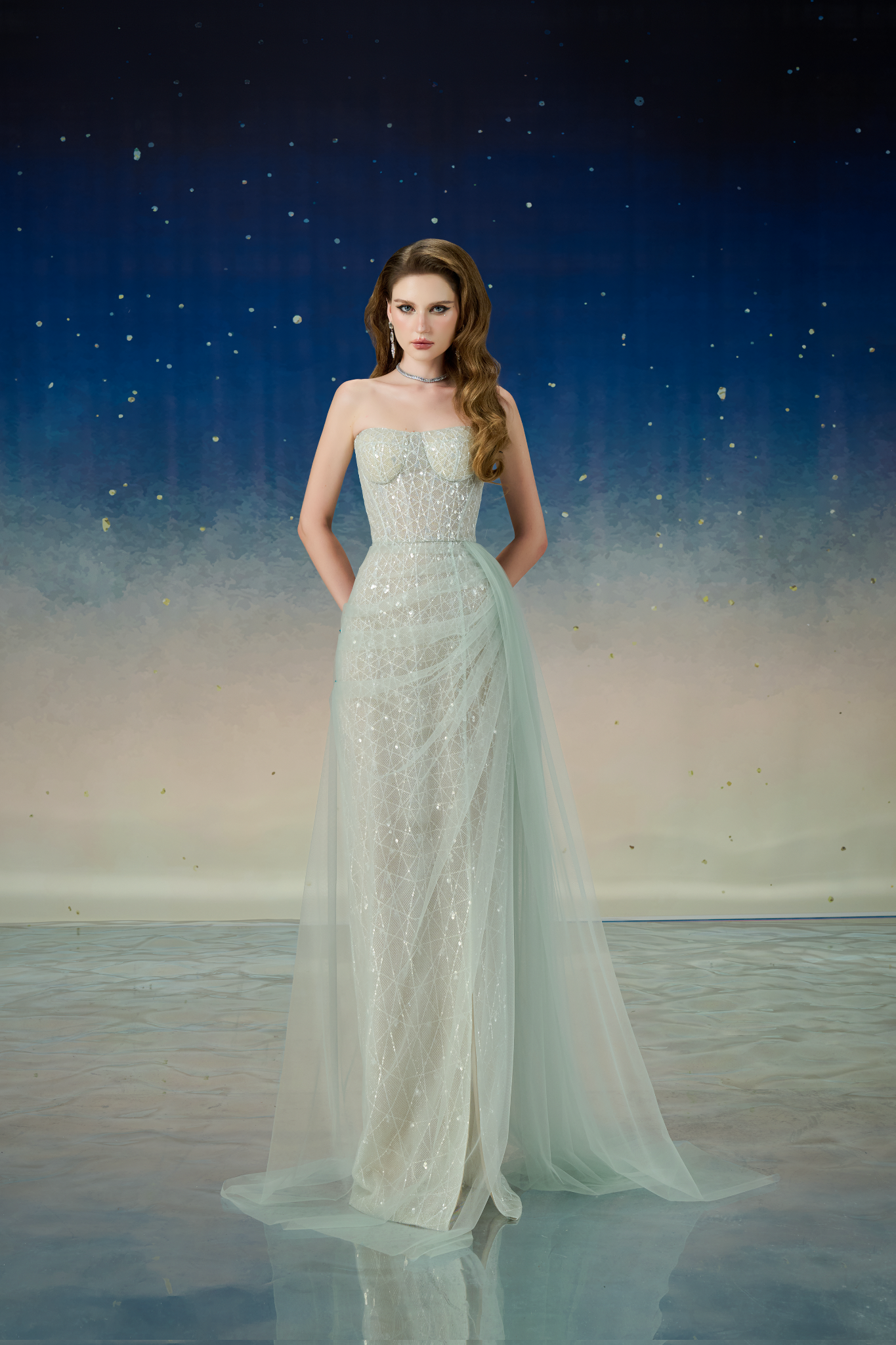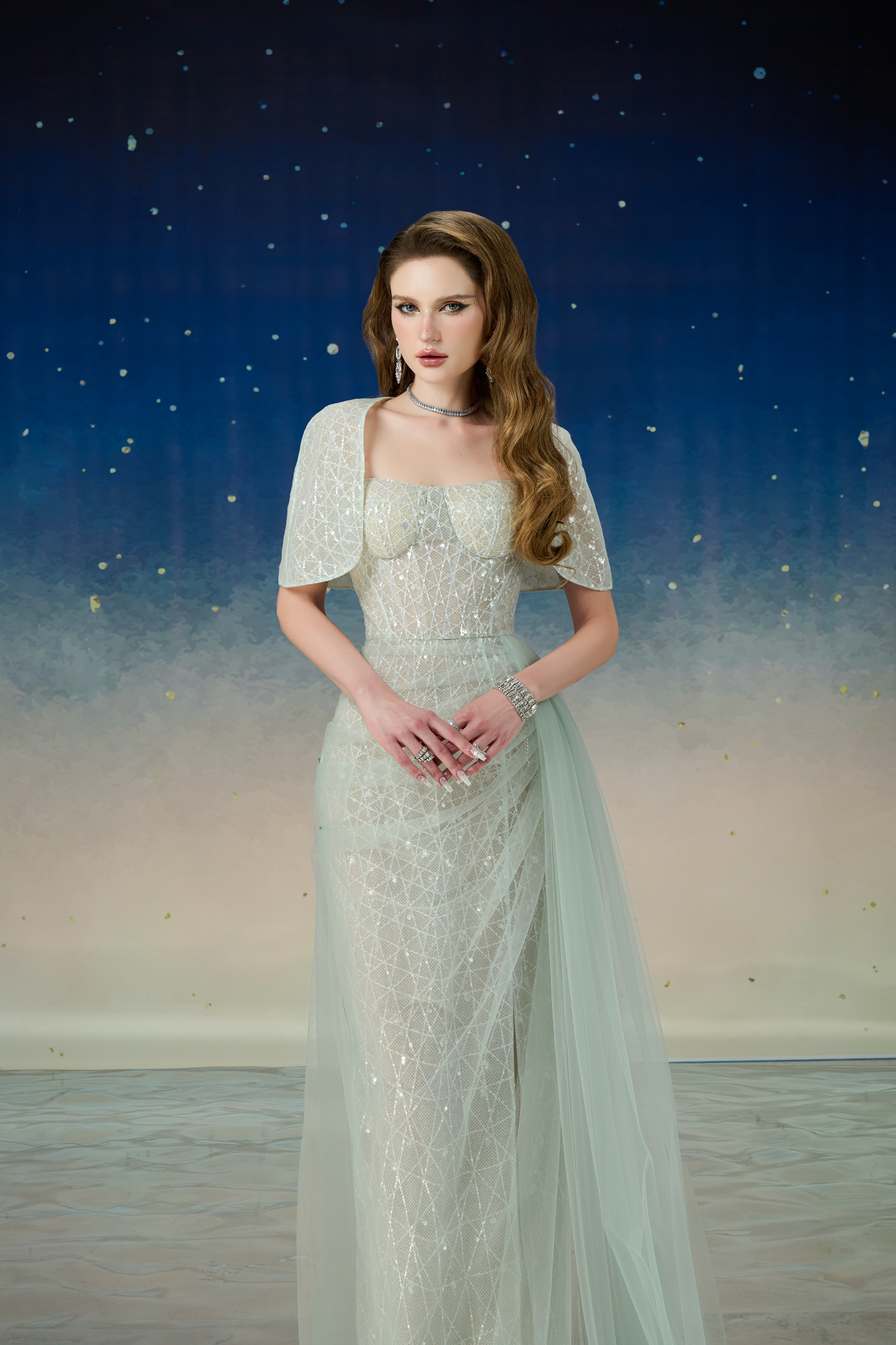 Chất liệu lưới kết với kim sa cao cấp tạo vẻ đẹp nhẹ nhàng nhưng vẫn đầy sự sang trọng và hút ánh nhìn.
