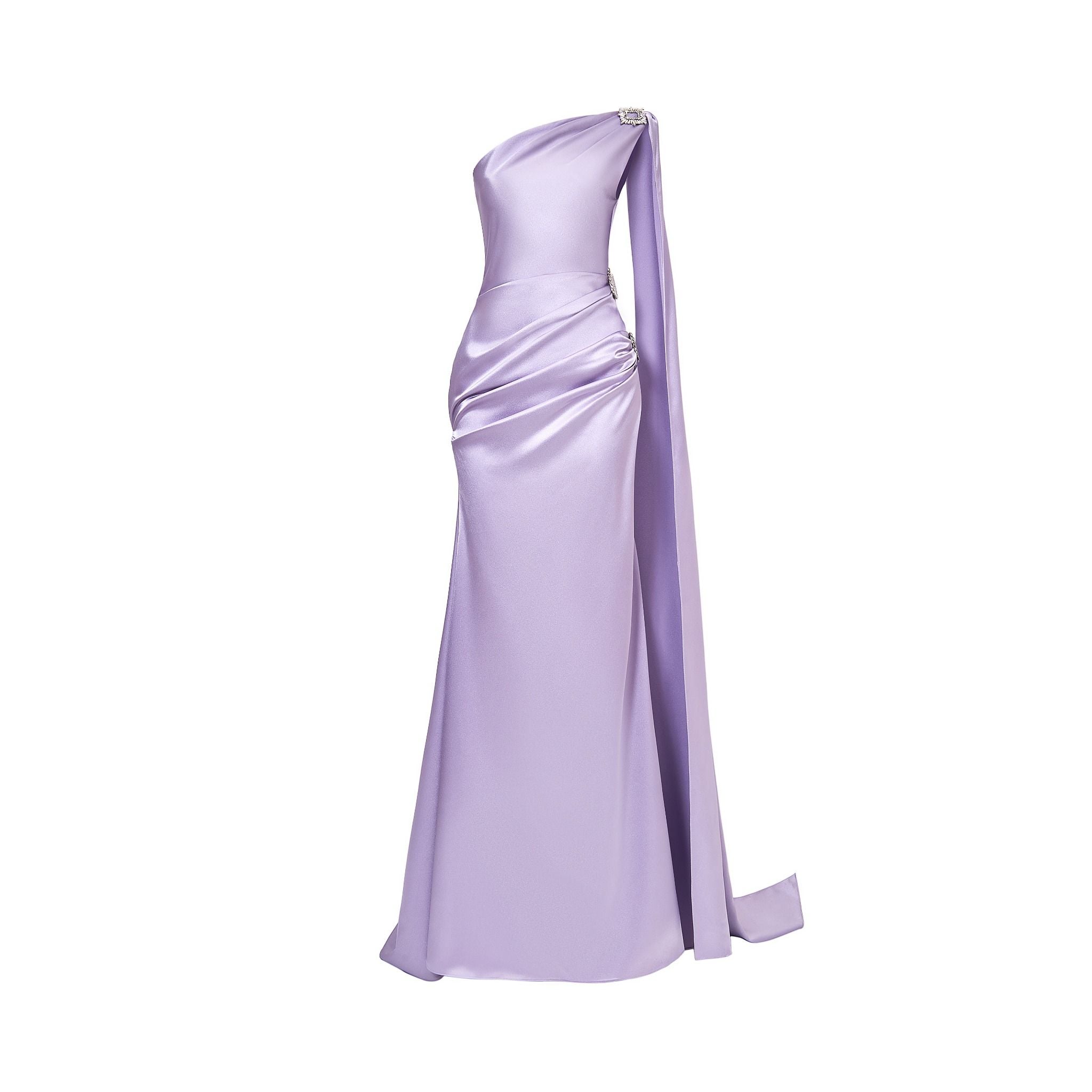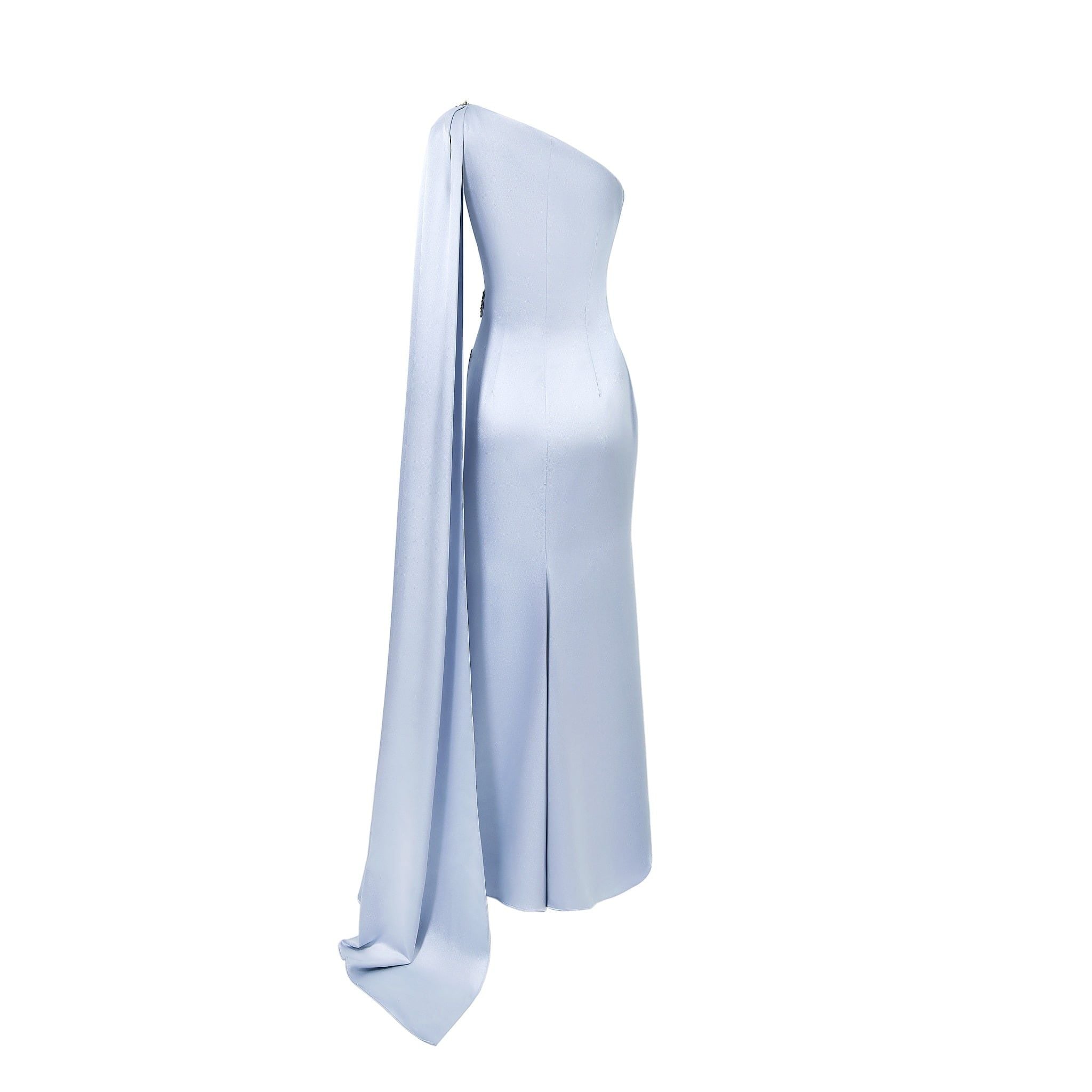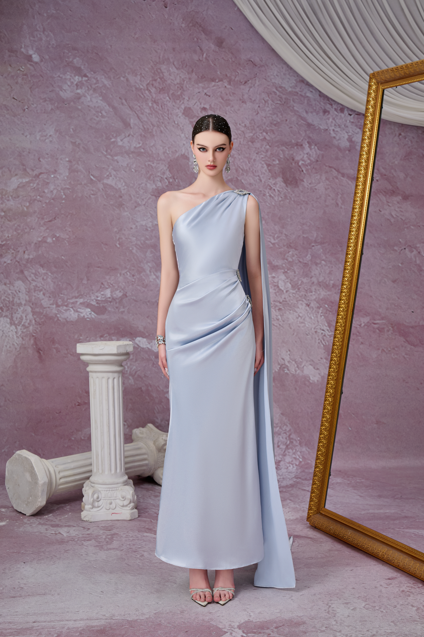 Đầm form ôm body đuôi cá ngắn với các nếp gấp mềm mại, tạo hiệu ứng sang trọng quý phái, kết hợp với tà vai dài thướt tha.