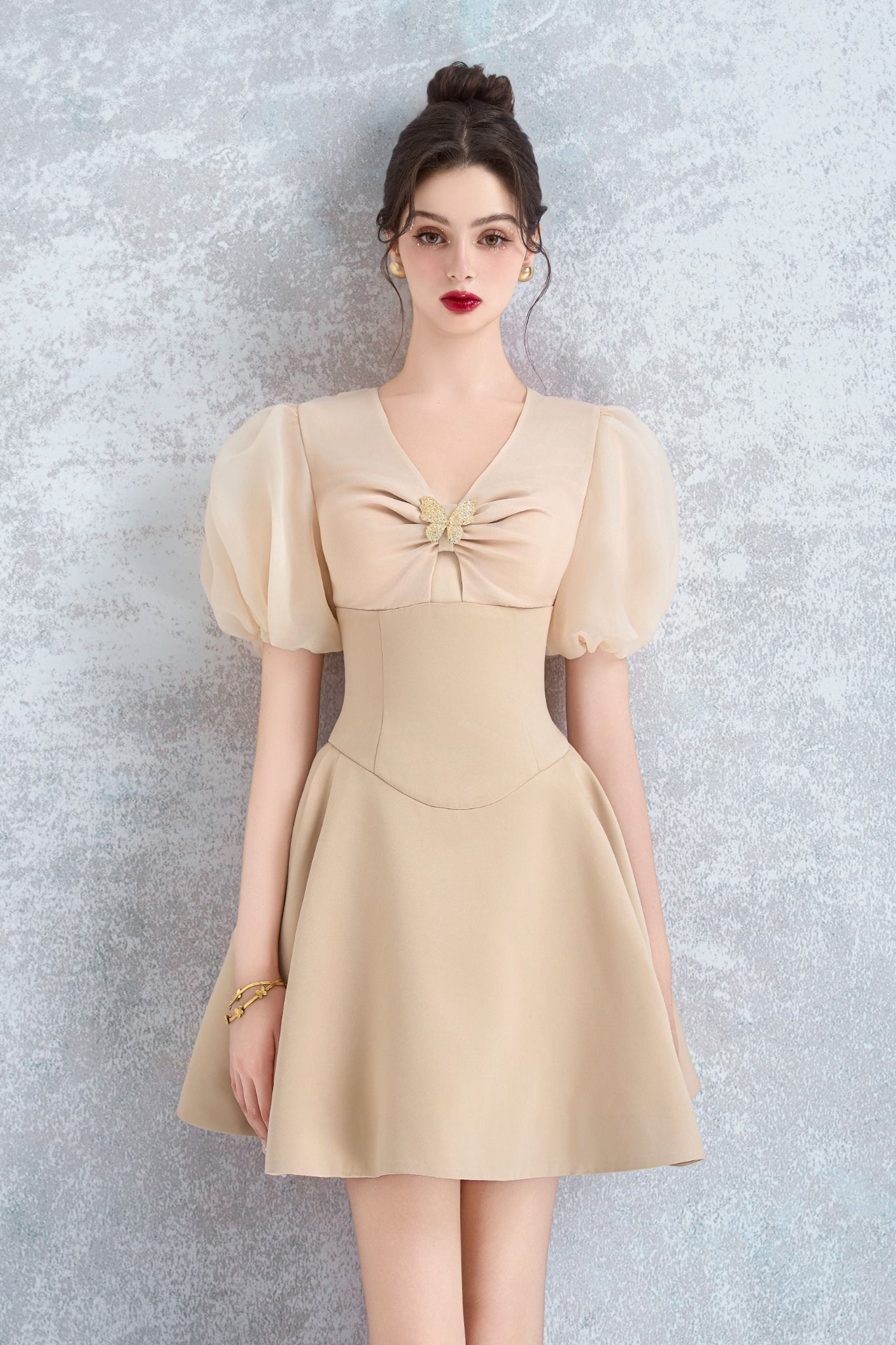 Dáng váy chữ A tay phồng với tùng váy xếp ly 2 bên hông, chiết eo cao tạo hiệu ứng thị giác cho vòng hai nhỏ nhắn. Chất liệu oganza đặc trưng của mùa hè phối cùng Satin mượt mà, mềm mại.