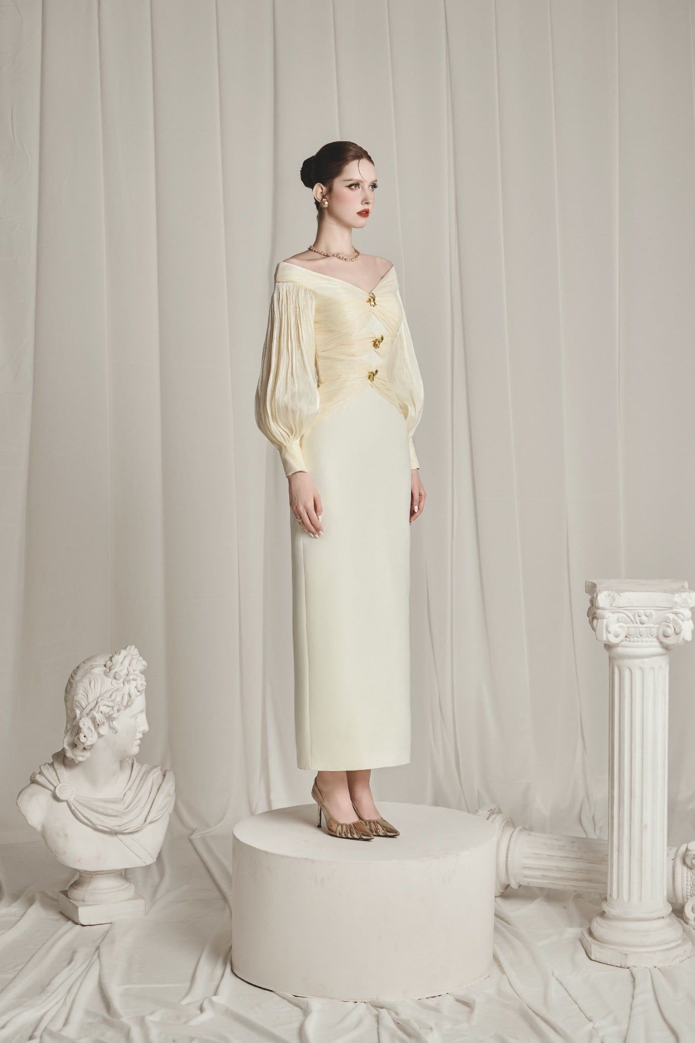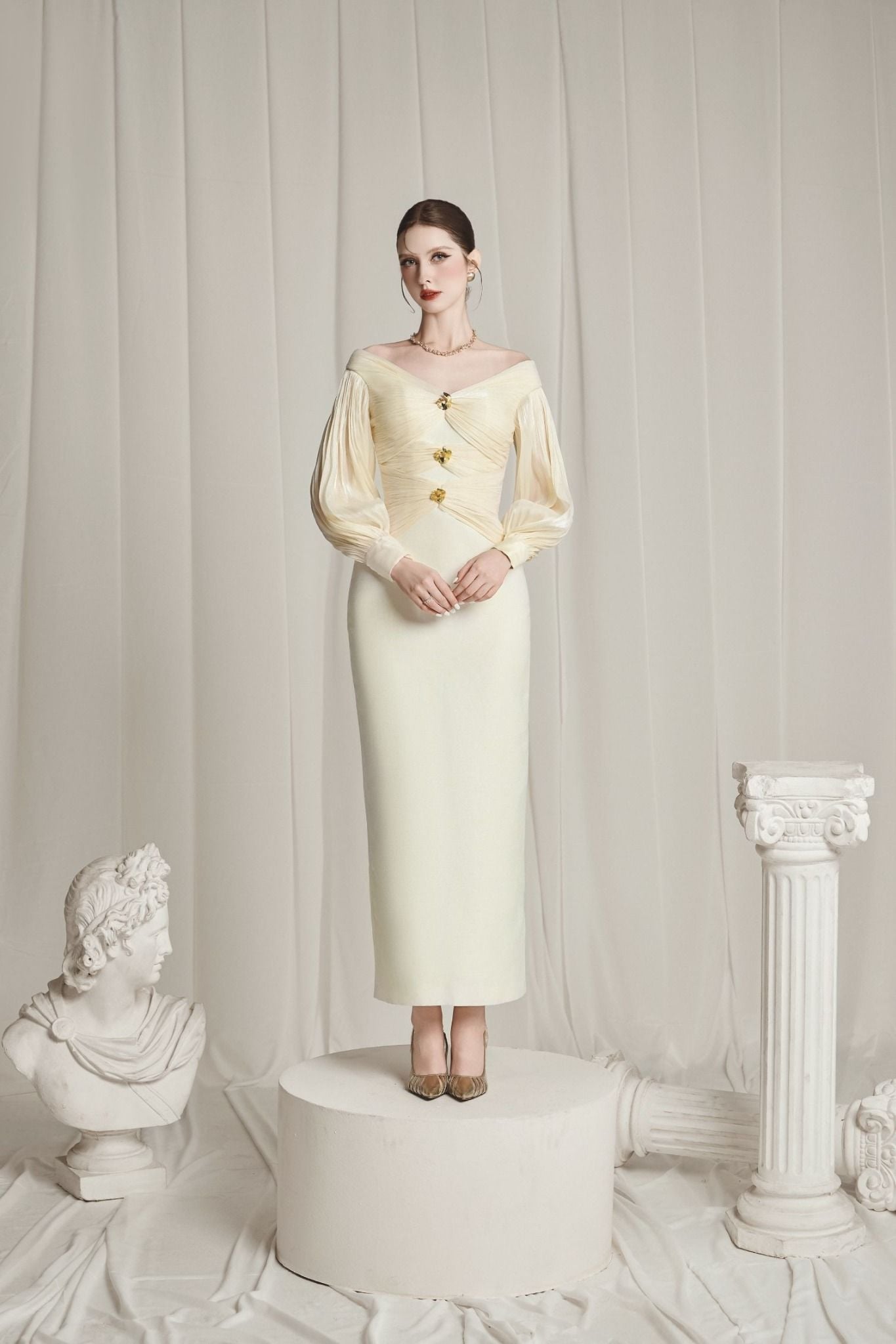 | Sleeves: Slightly puffed long sleeves for an elegant and powerful look | |