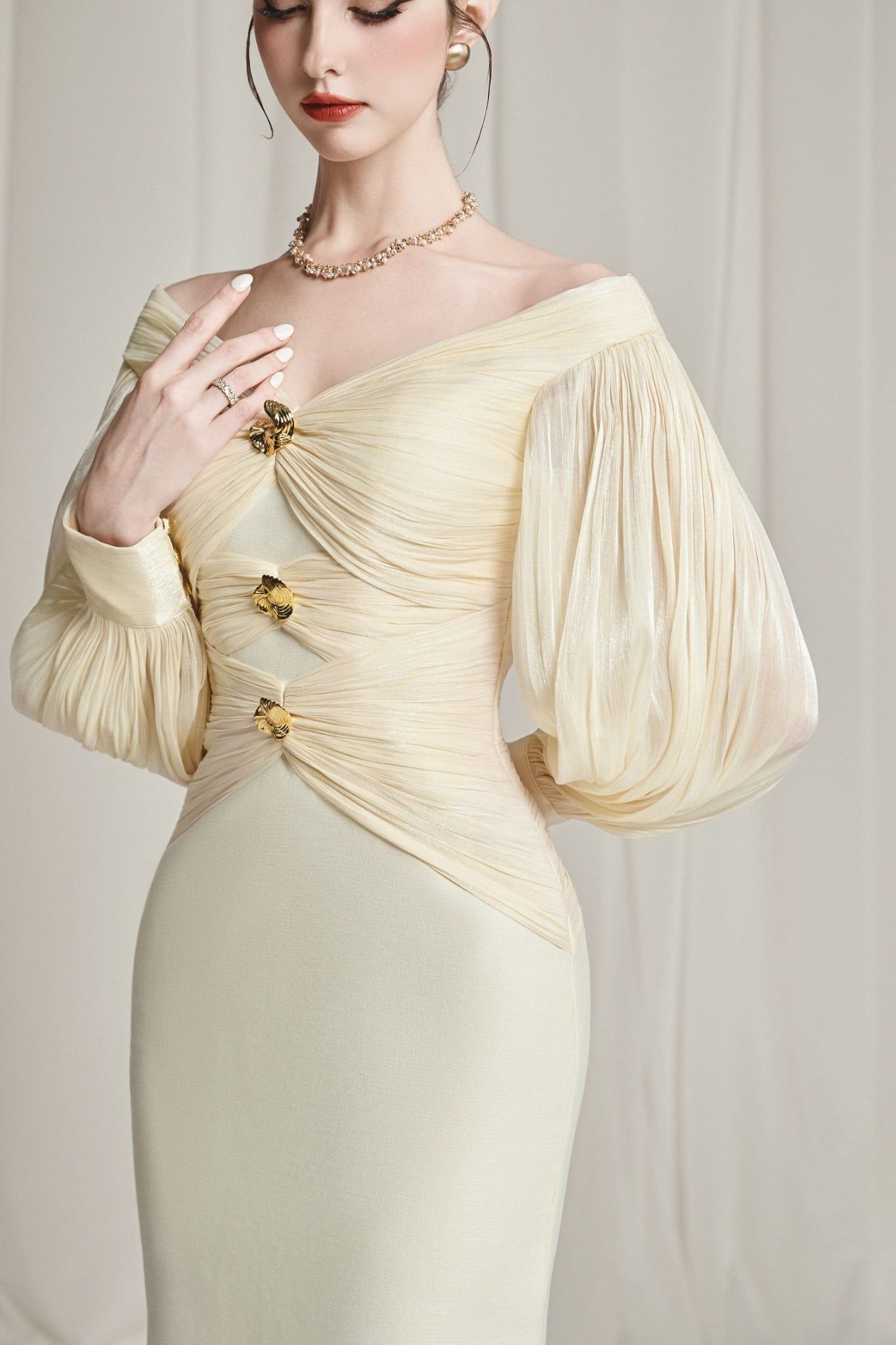 Nythera Cream Gold Off Shoulder Draping Dress
