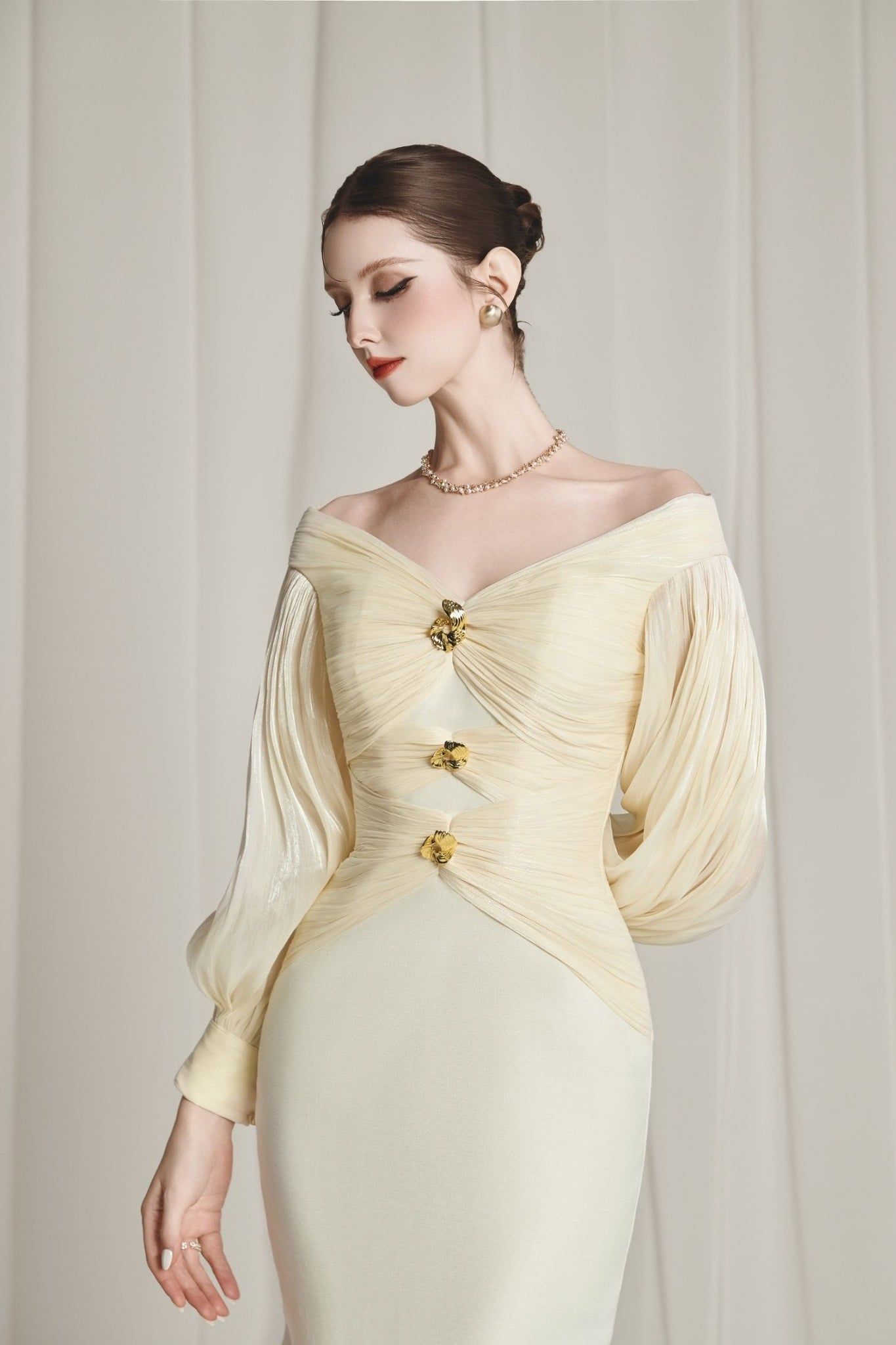 | Neckline: Off-shoulder V-neckline designed to showcase the collarbone | |
