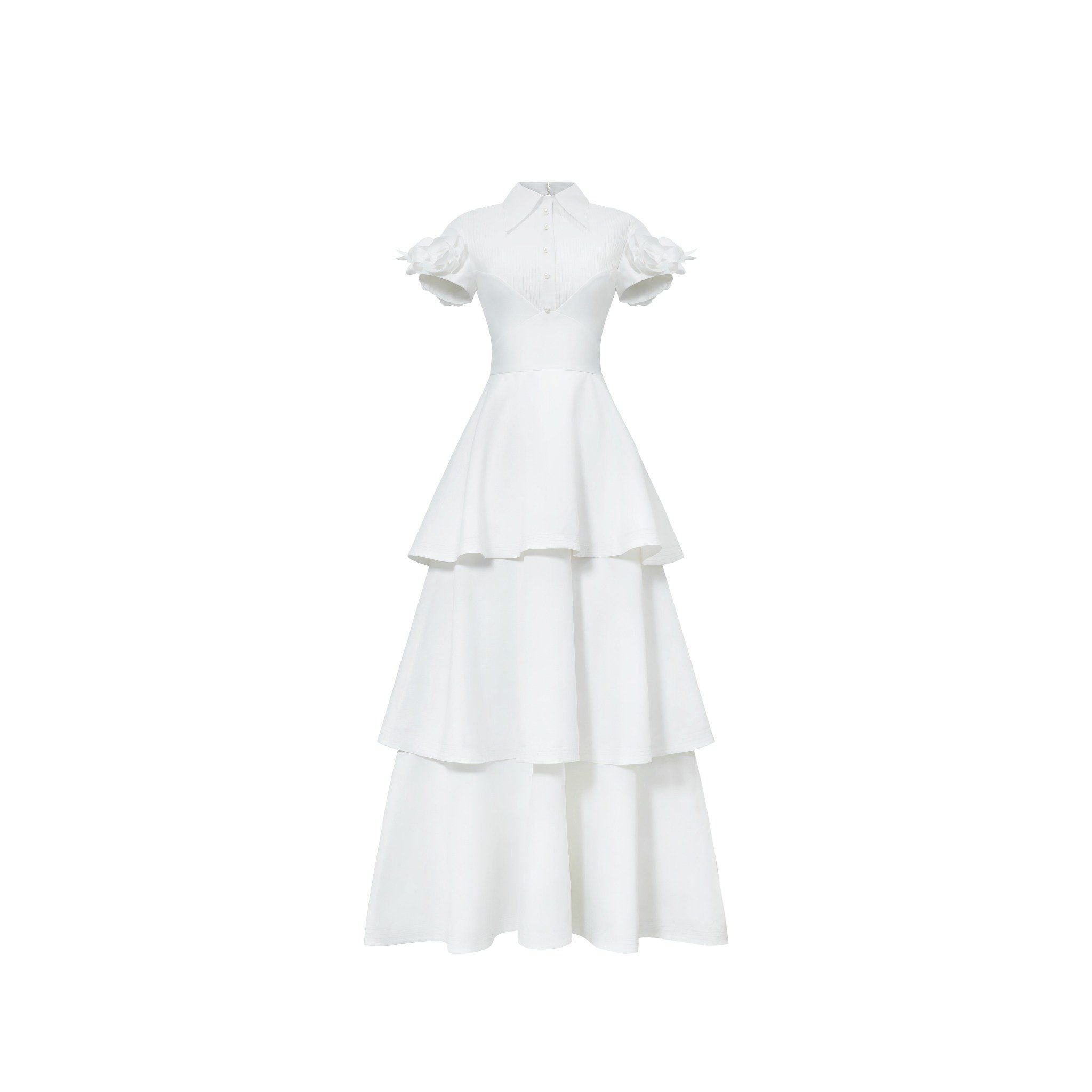 Đầm cổ sơ mi có phần ngực dập ly,tay đính hoa tạo điểm nhấn ,phần tùng xoè với 3 tầng đều giúp hách dáng.