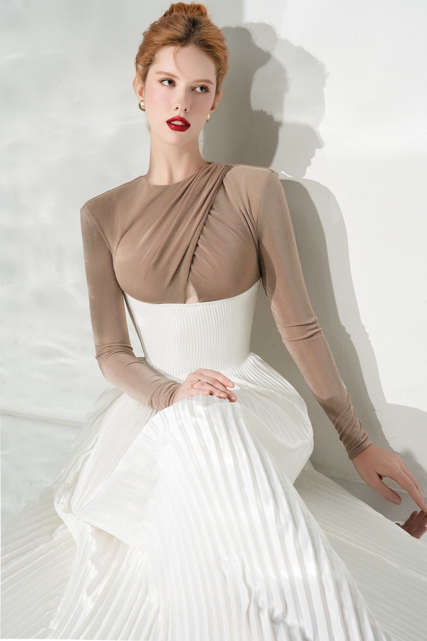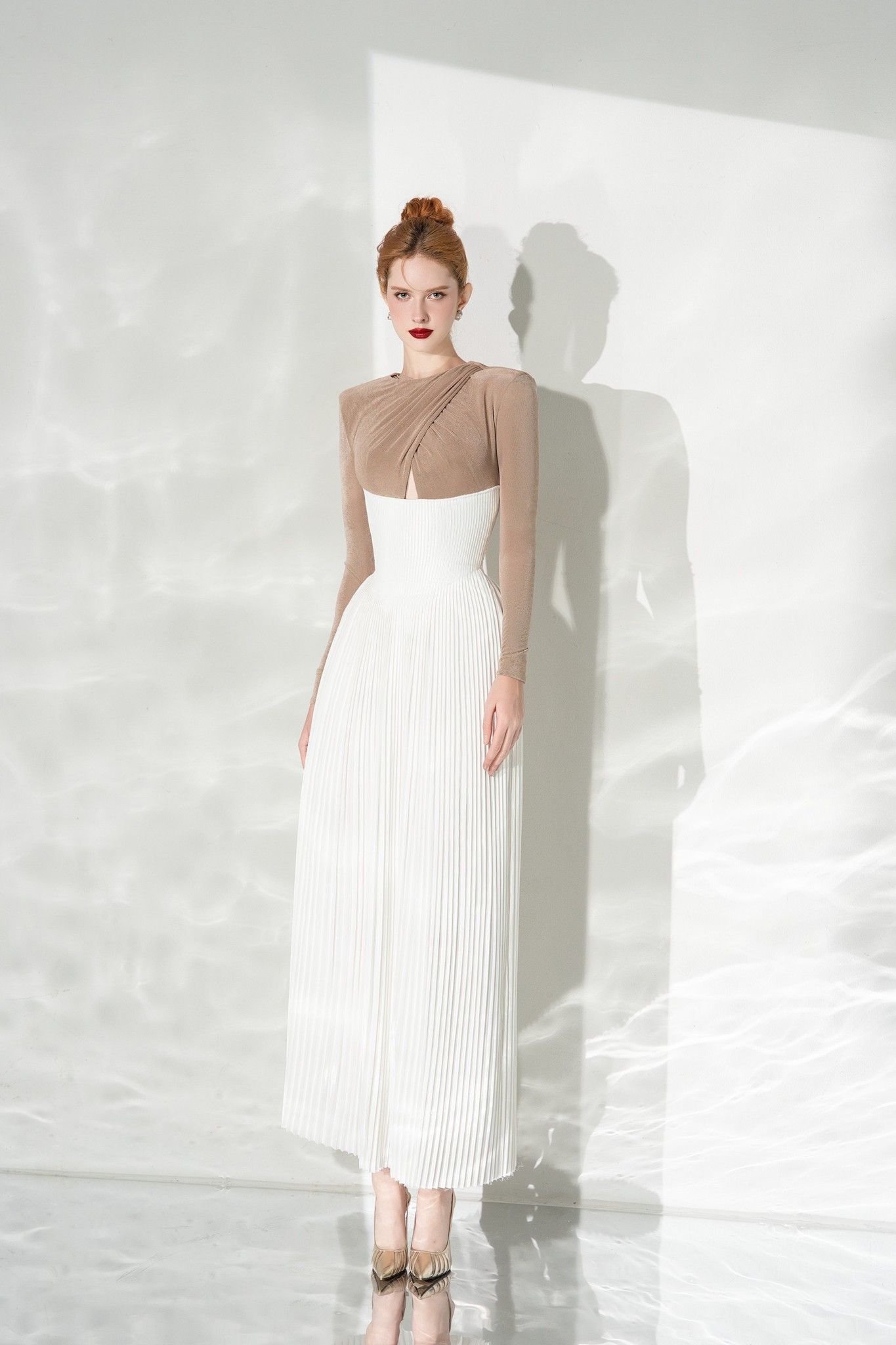 The unique point of the Poise Dress design lies in the collar, with delicate and creative crisscross details. The shape is designed to highlight the natural curves of the body, especially the waist as a perfectly carved detail with delicate pleated stamping technique. Poise Dress brings novelty and originality that not only creates an artistic highlight but also increases the charm and femininity of Calista's Muse.