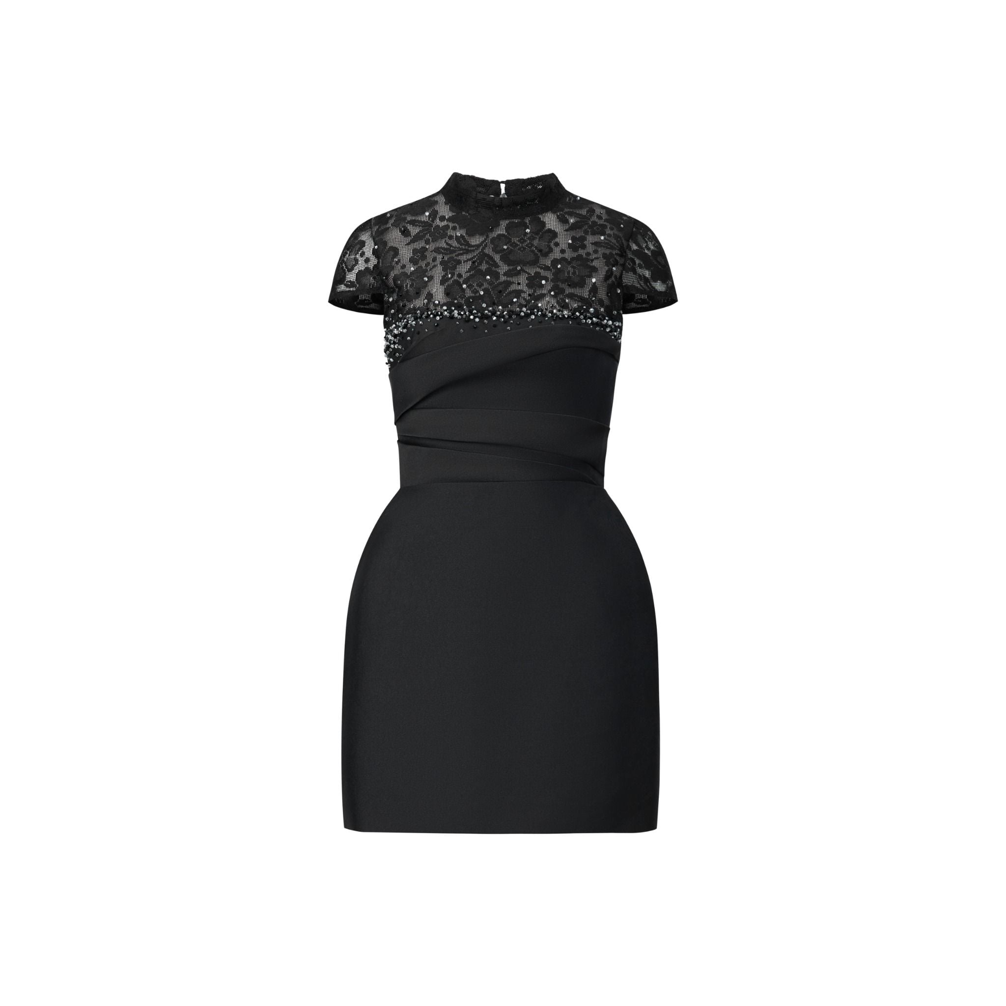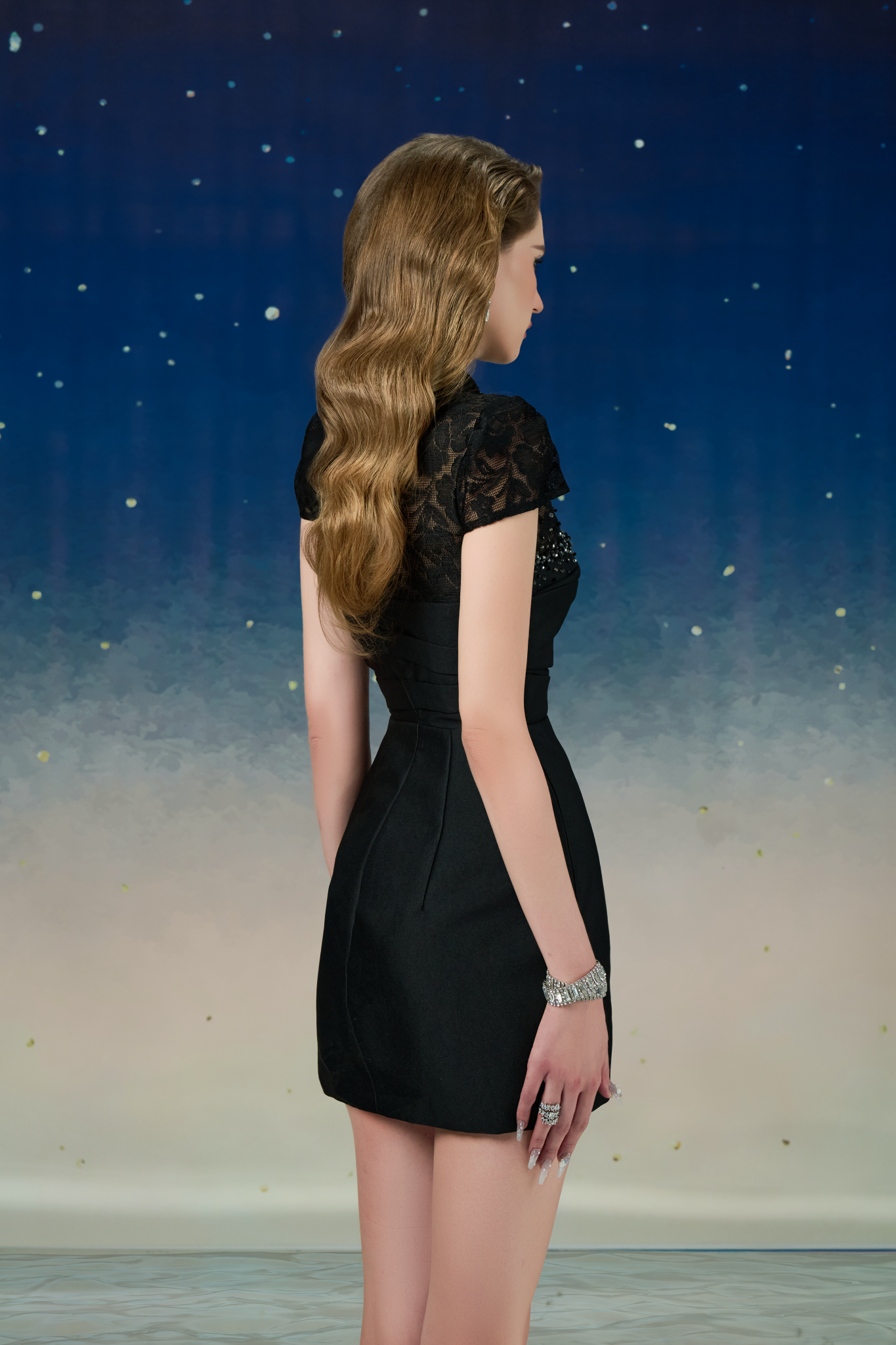 Chất liệu cao cấp tạo sự bắt phom chuẩn sát tôn lên vẻ đẹp của người mặc. Ren được đính kết với pha lê ẩn hiện, huyền bí như những vì sao trên bầu trời