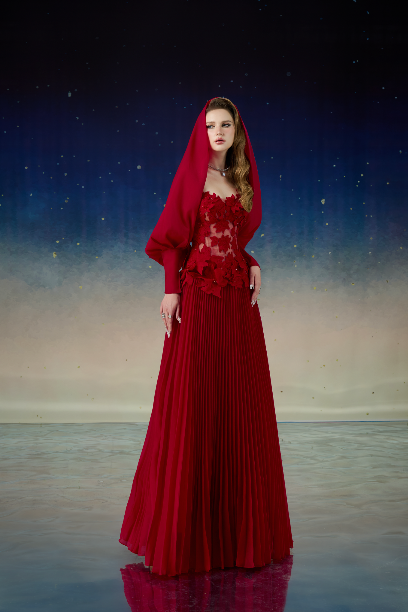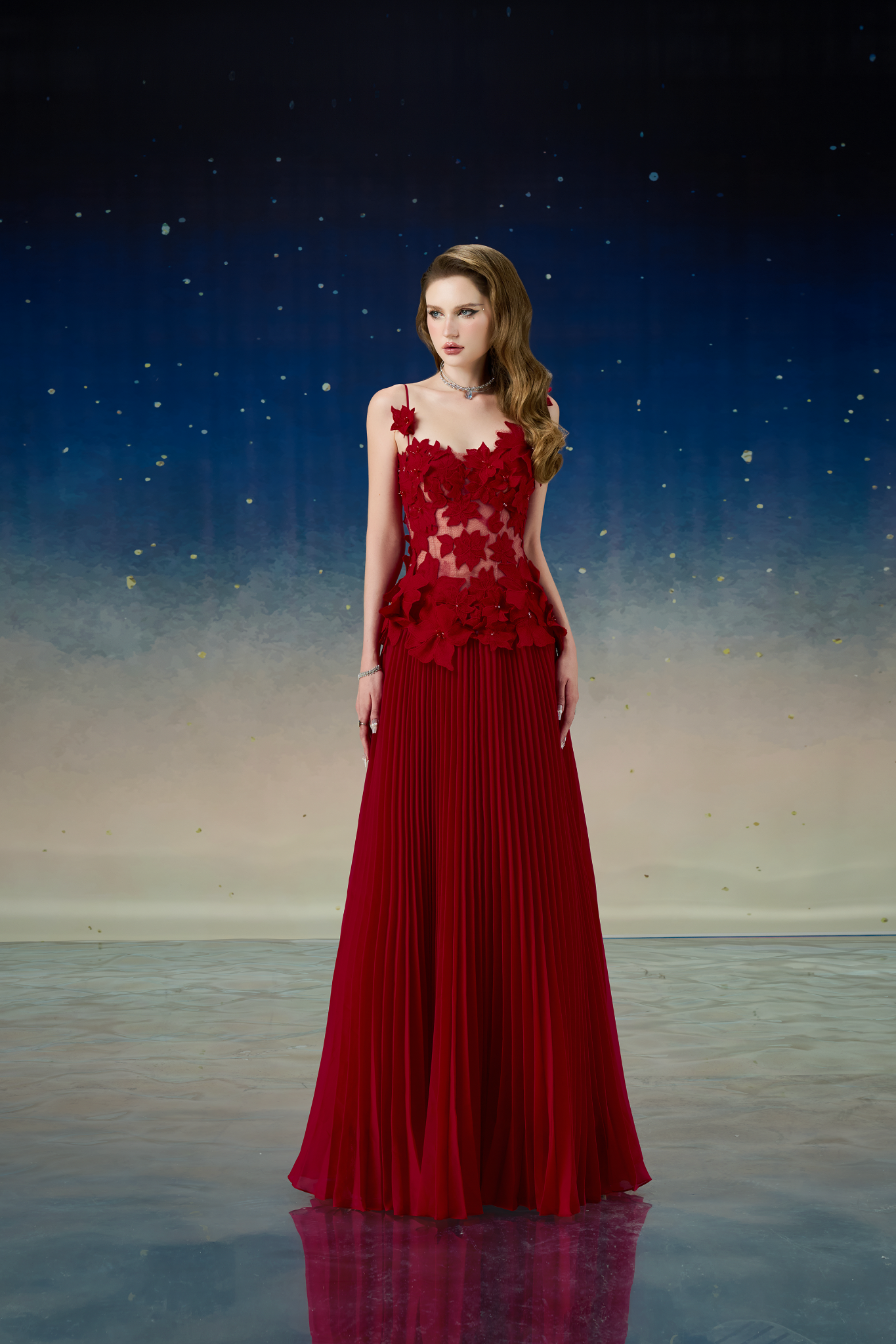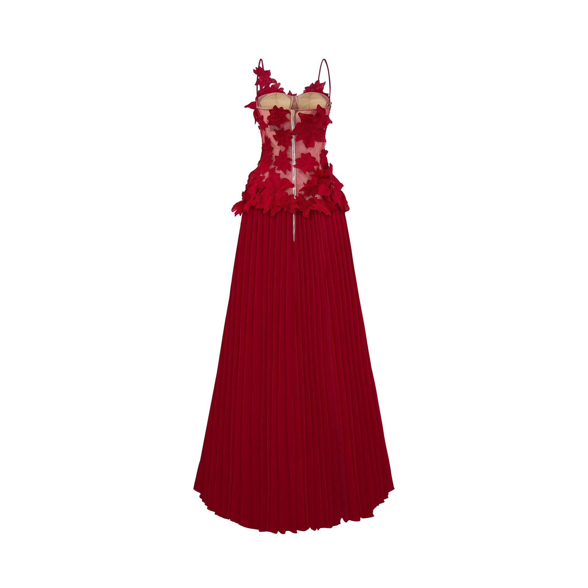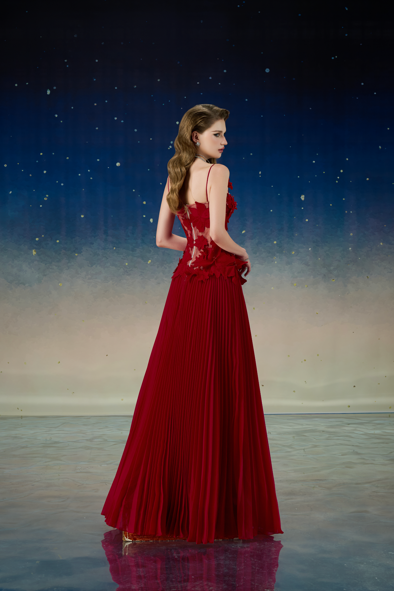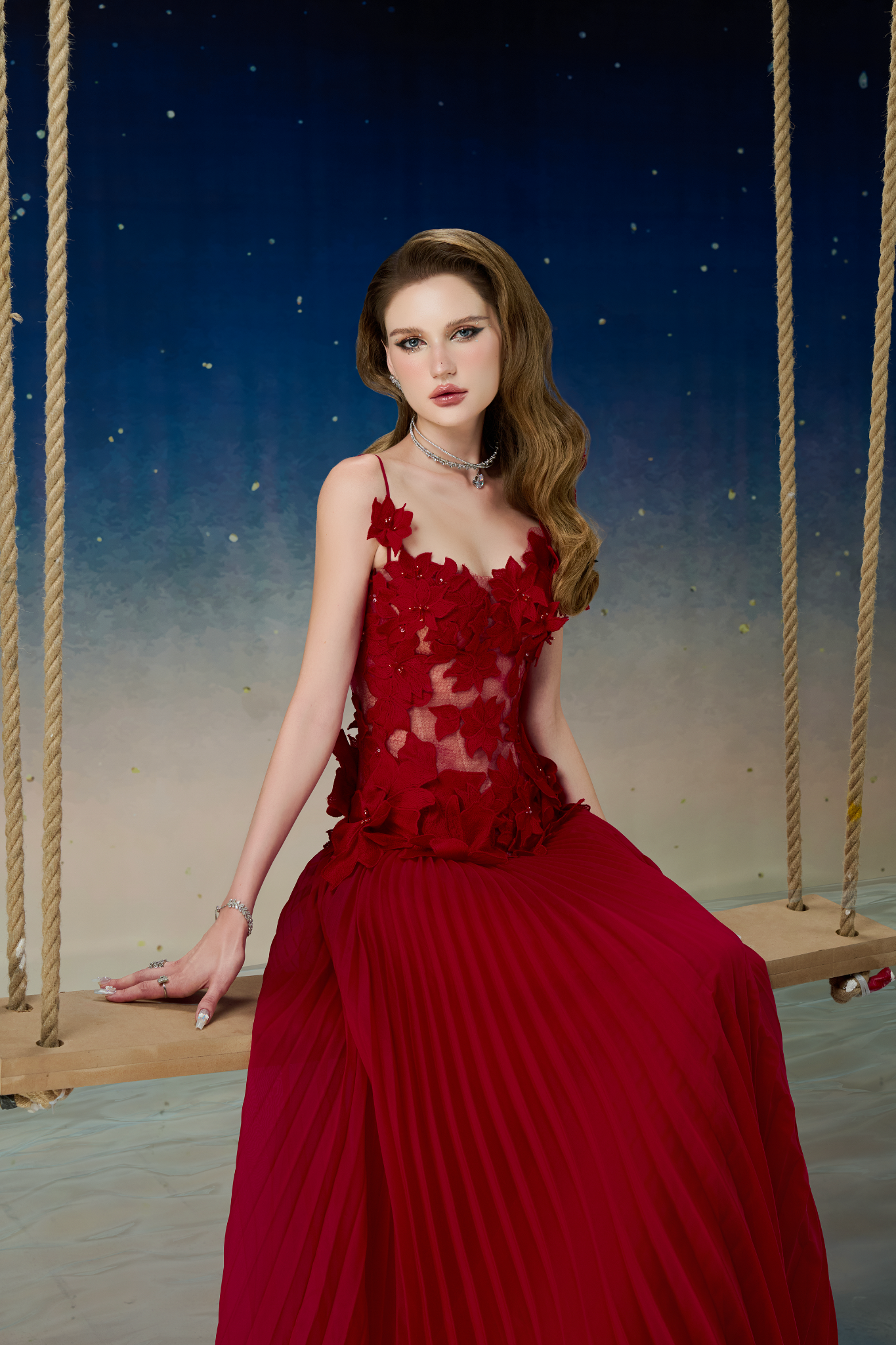Phom váy dập li kết hợp corset với phần hạ eo được tính toán kỹ lưỡng giúp người mặc có đạt được tỉ lệ vàng. Detail hoa được đính kết 3D hút ánh nhìn.
