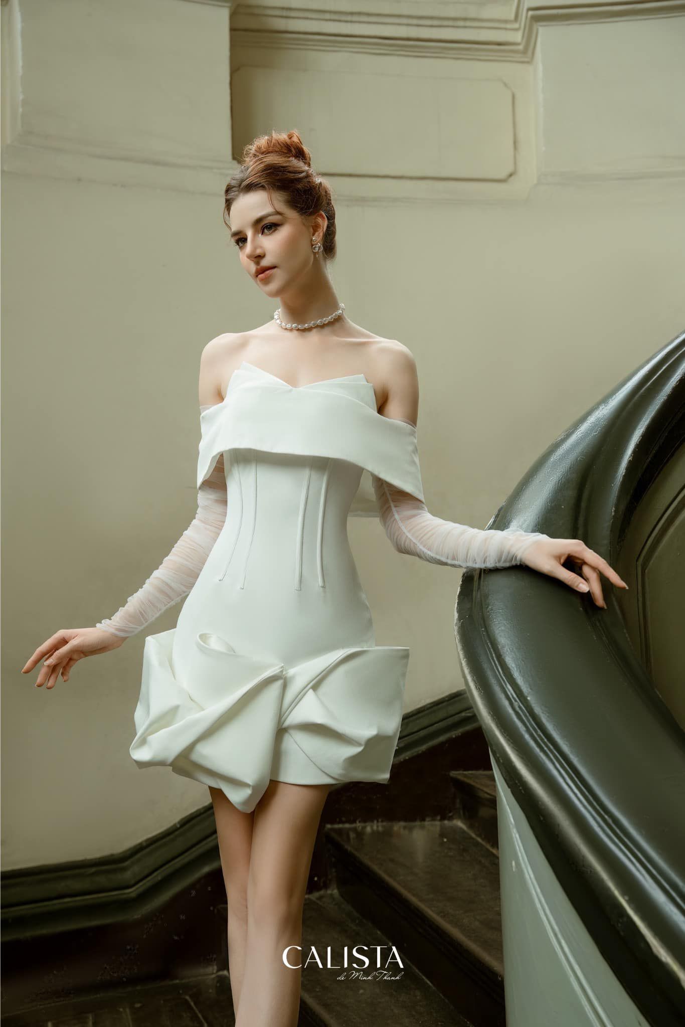 Embellished with delicate lines along the body of the shirt, lovely off-the-shoulder details carved on high-quality silk fabric combined with gentle tulle to highlight the collarbones, ivory shoulders.