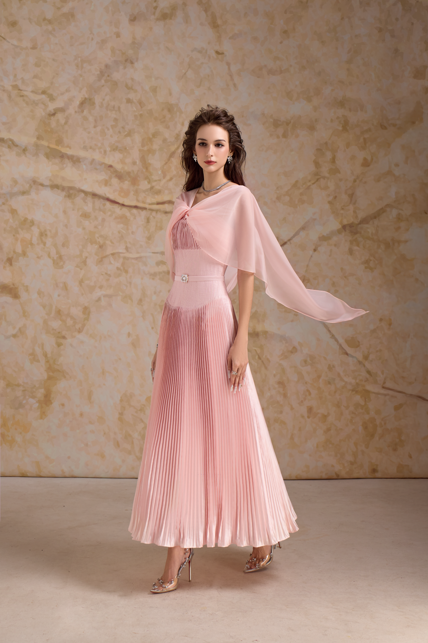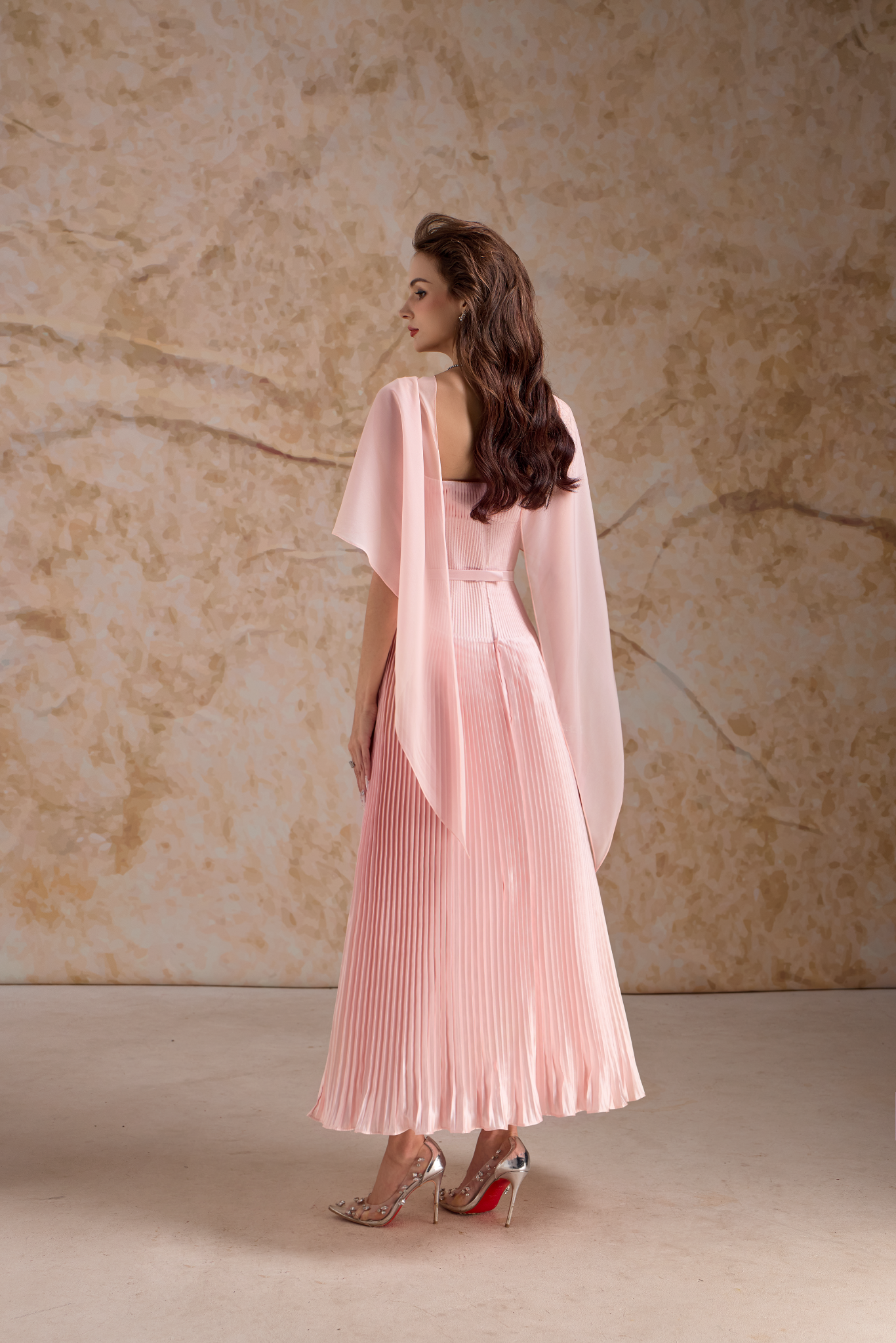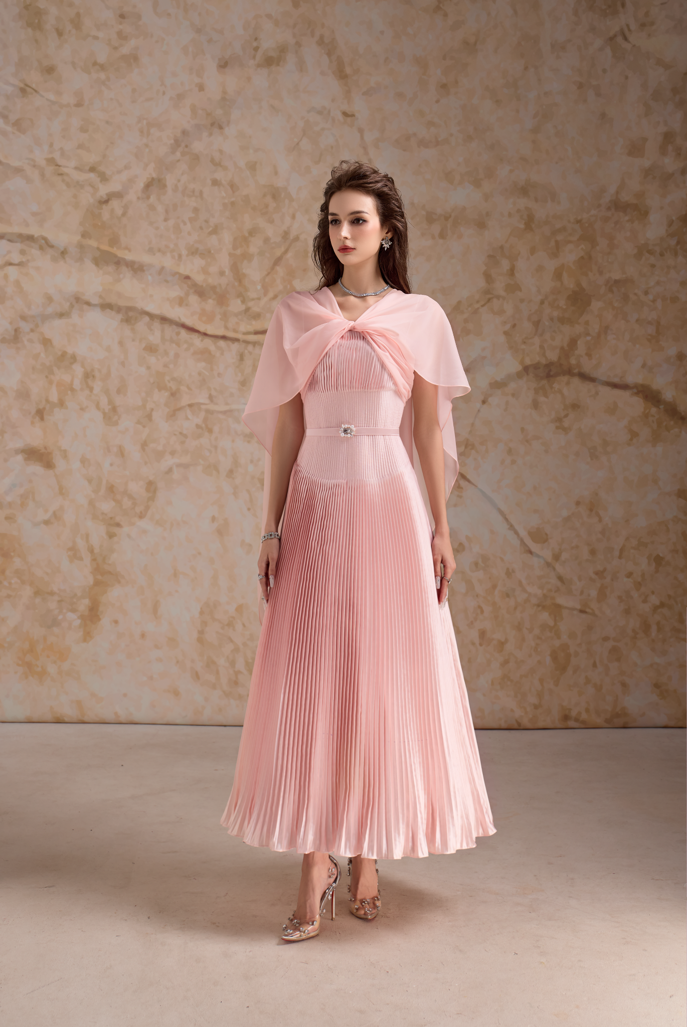 Thân áo ôm sát tôn lên đường cong chuẩn mực, tạo nên sự tương phản tinh tế với tùng váy dập ly cầu kì - điều khiến Calista luôn tự hào về tính ước lệ trong nghệ thuật tạo hình của thương hiệu.