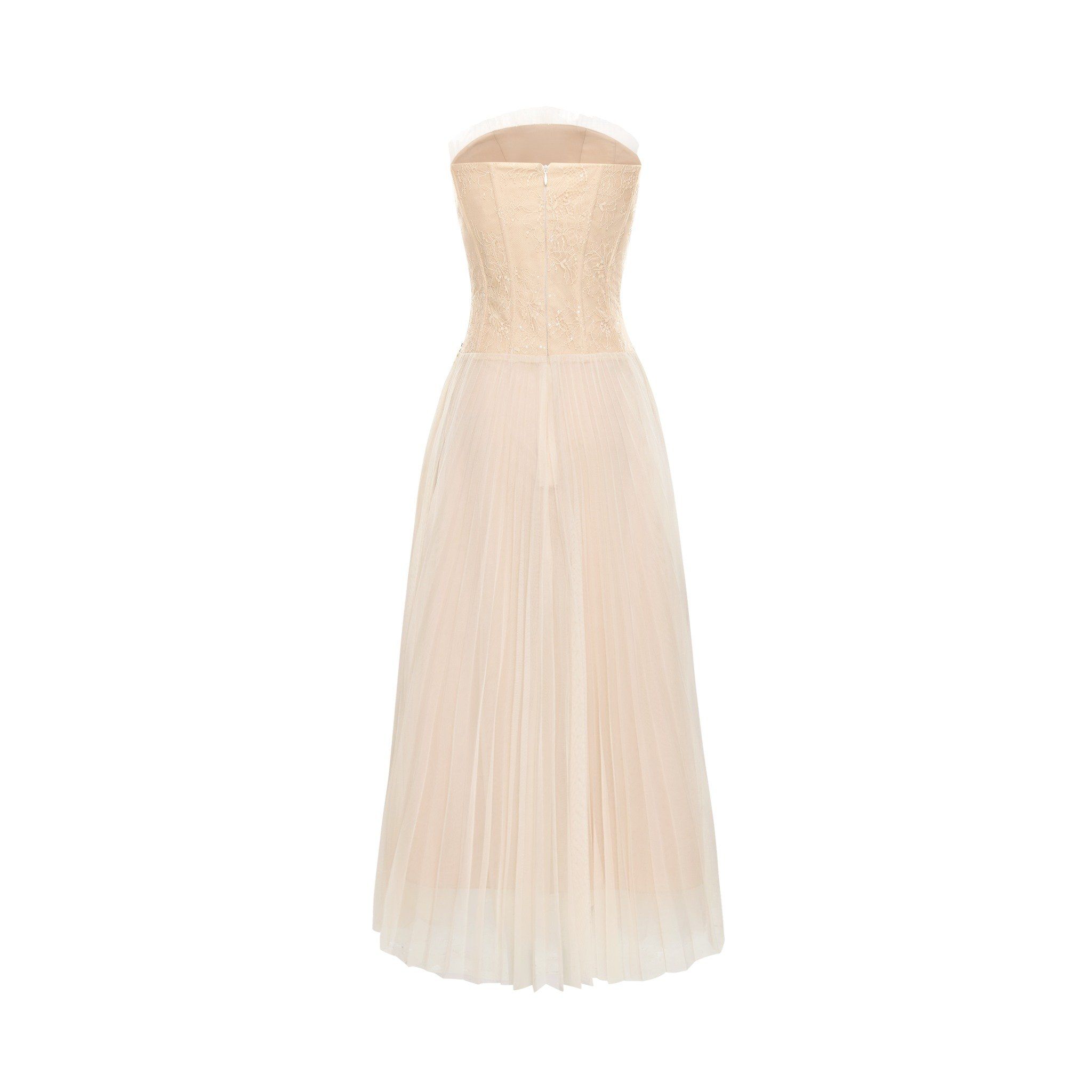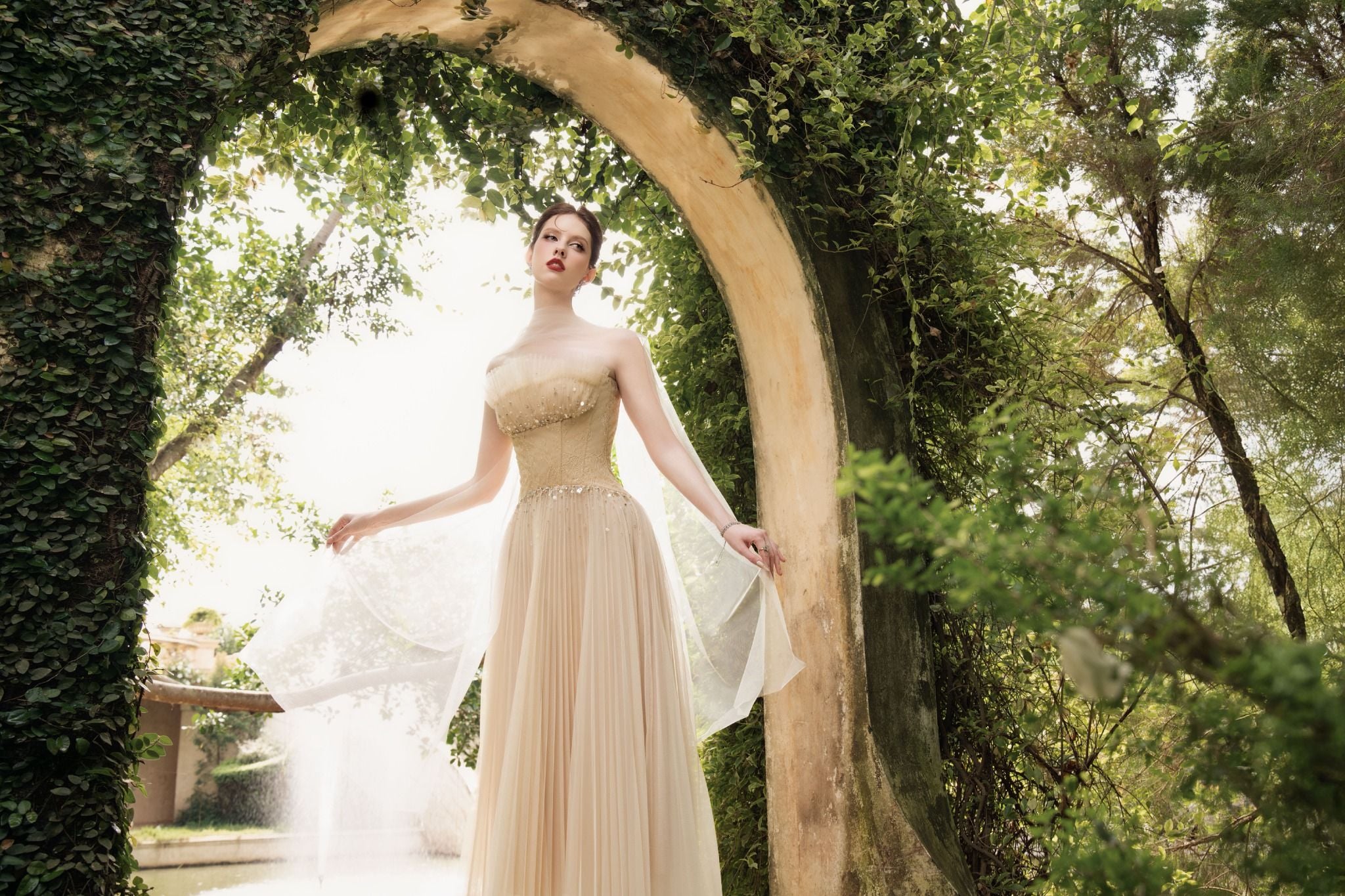 An ethereal strapless gown with sheer draped details, hand embellishments, and a pleated flowing skirt, capturing timeless elegance.
