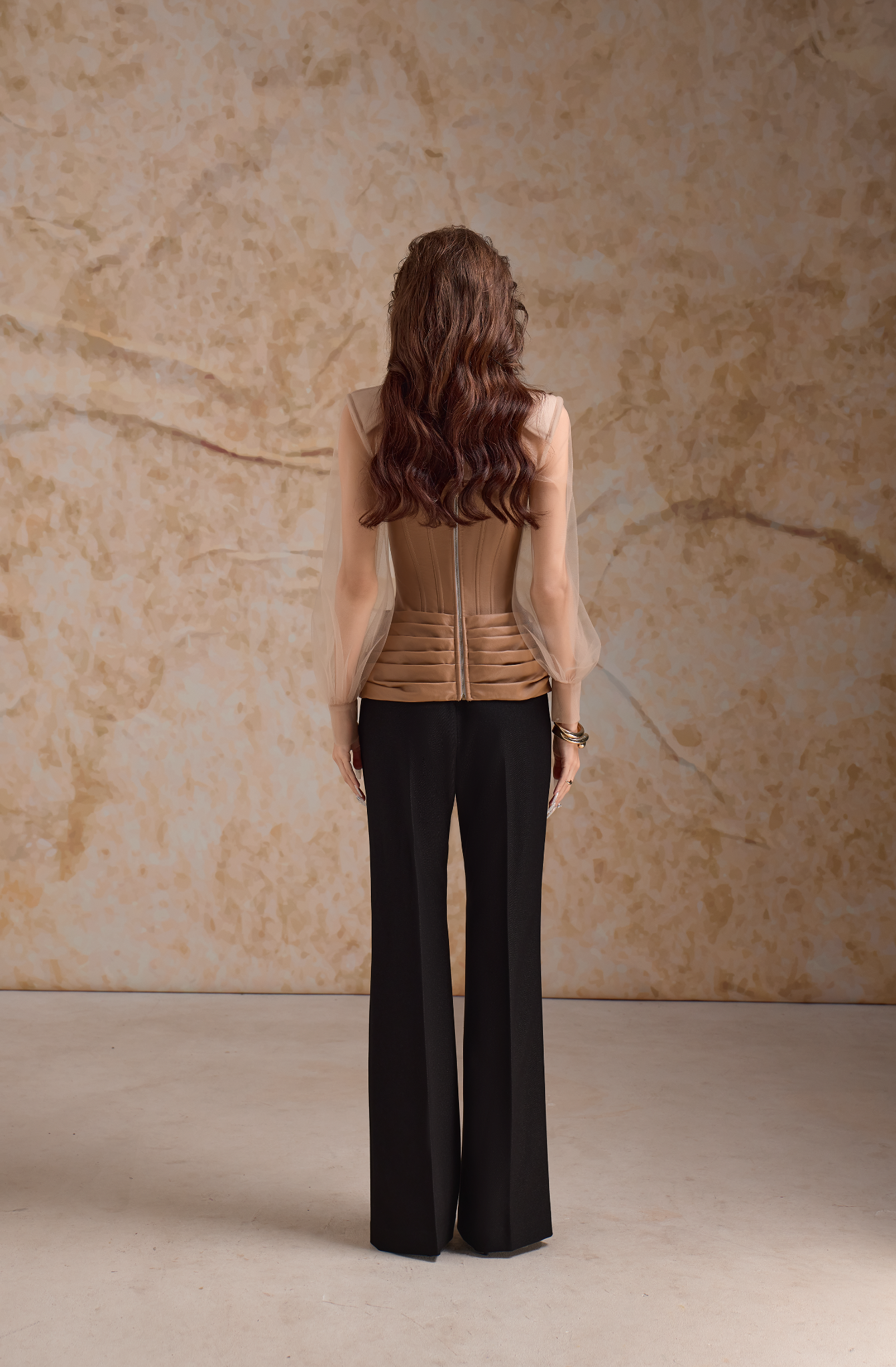 Phẩm chất kiêu kì, quyến rũ của chất liệu da được ưu ái tại Calista trên các thiết kế mùa mới. Corset siết eo và bắt xếp ly ngang tạo hiệu ứng thị giác để phần hông trông đầy đặn hơn. Calista làm mềm mại lại bản phối nổi bật này với áo sơ mi xuyên thấu và quần tây ống loe nhẹ thanh lịch.
