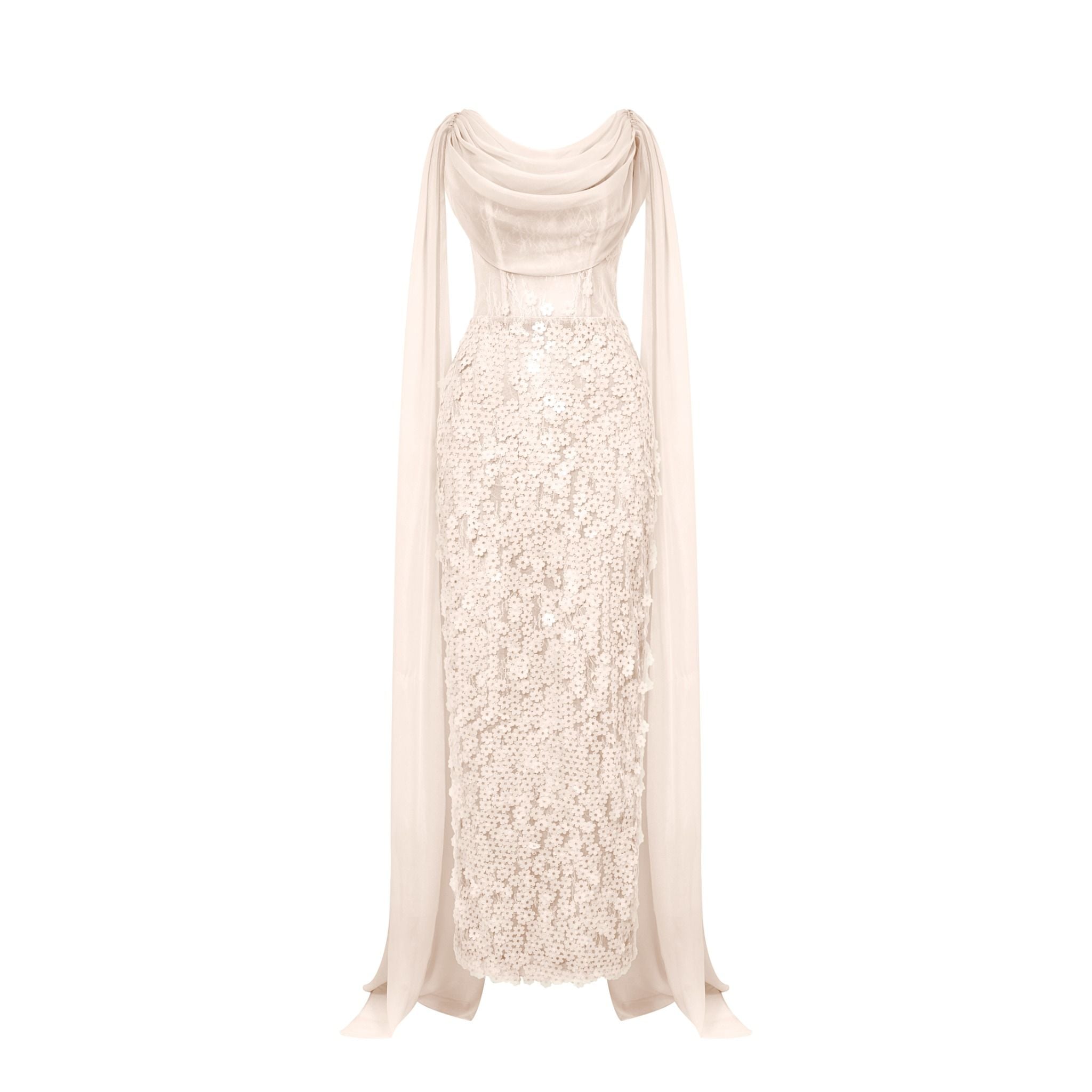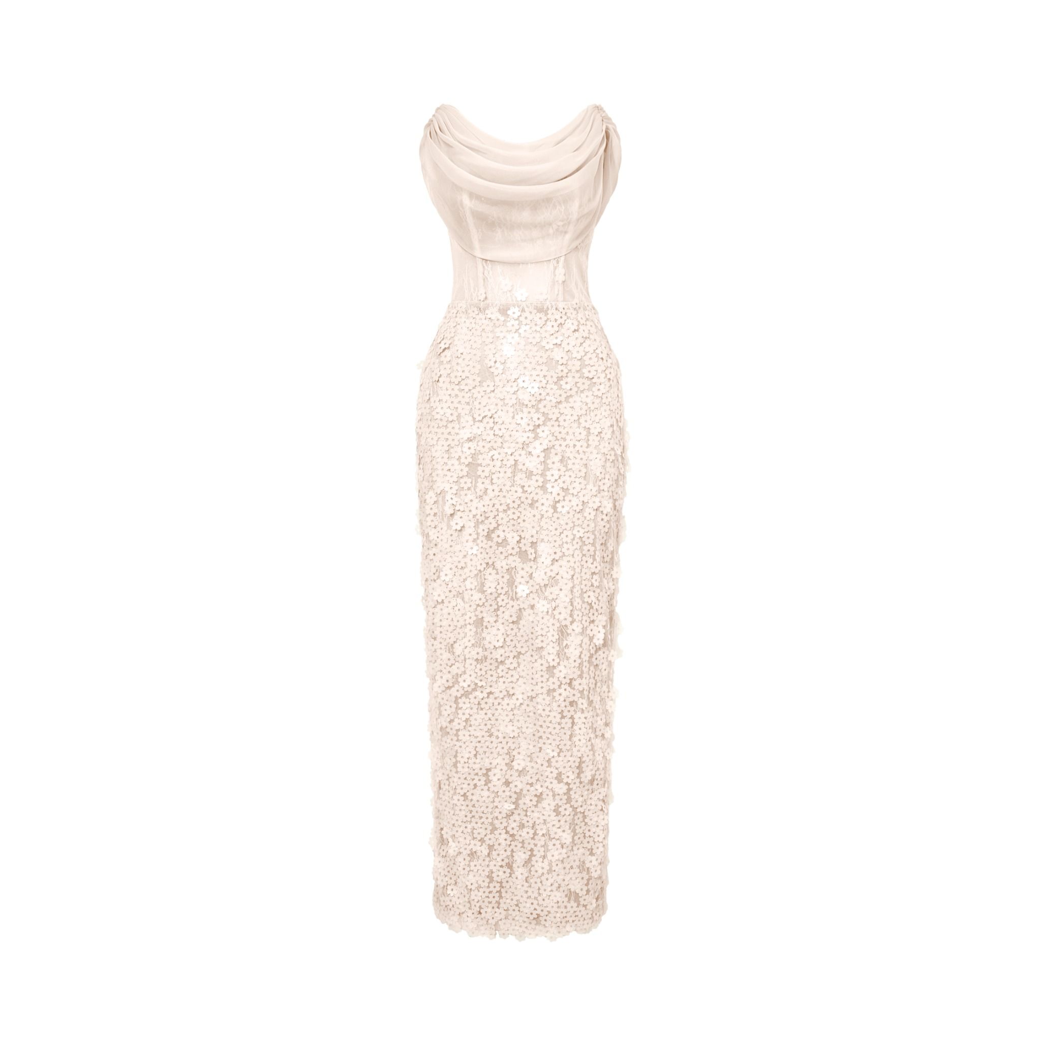 Thân dưới là sự kết hợp của vải lưới đính hàng nghìn bông hoa lạ mắt.