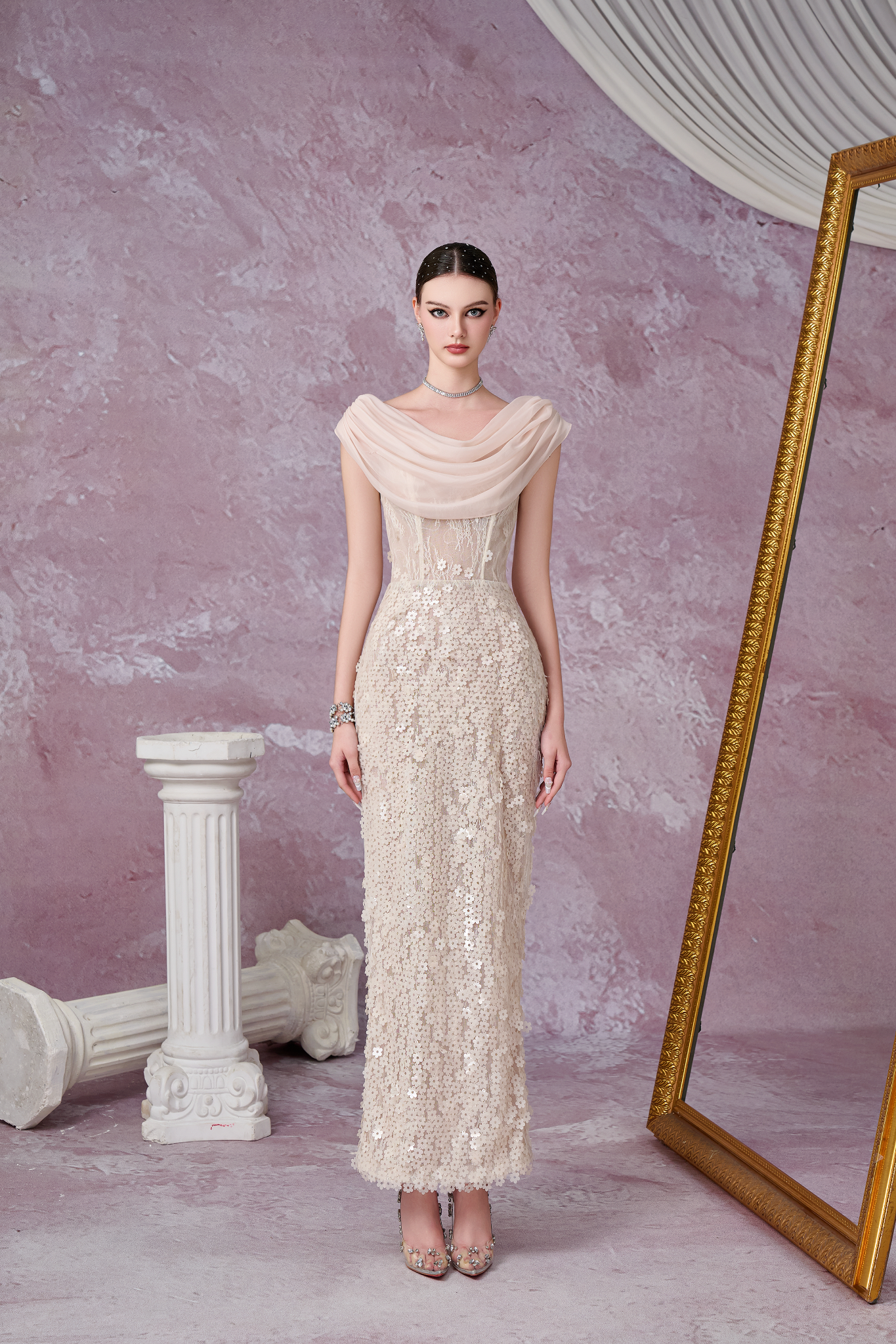 Thiết kế cổ đổ bằng chất liệu tơ mềm mại, kết hợp phần thân trên sử dụng vải ren hoa văn.