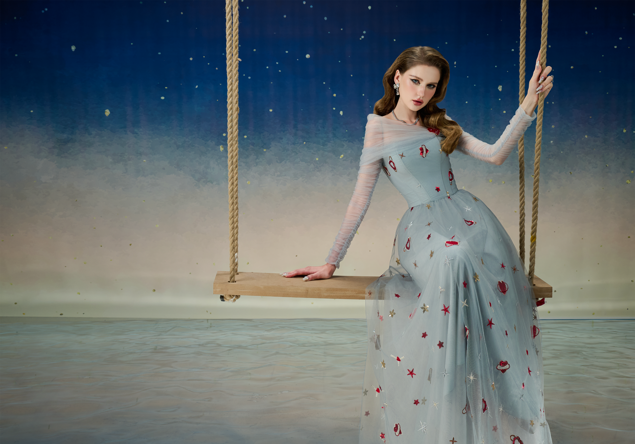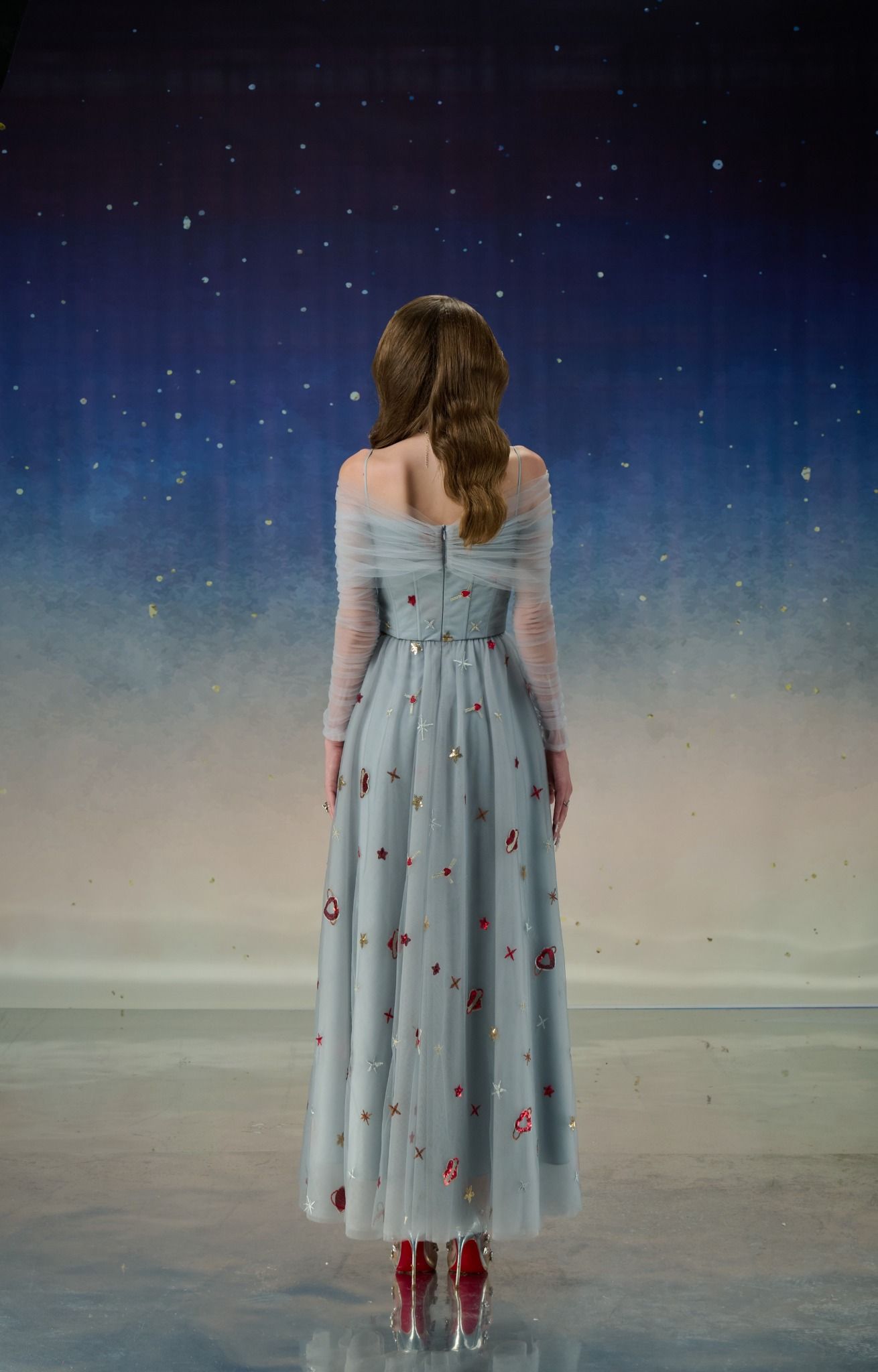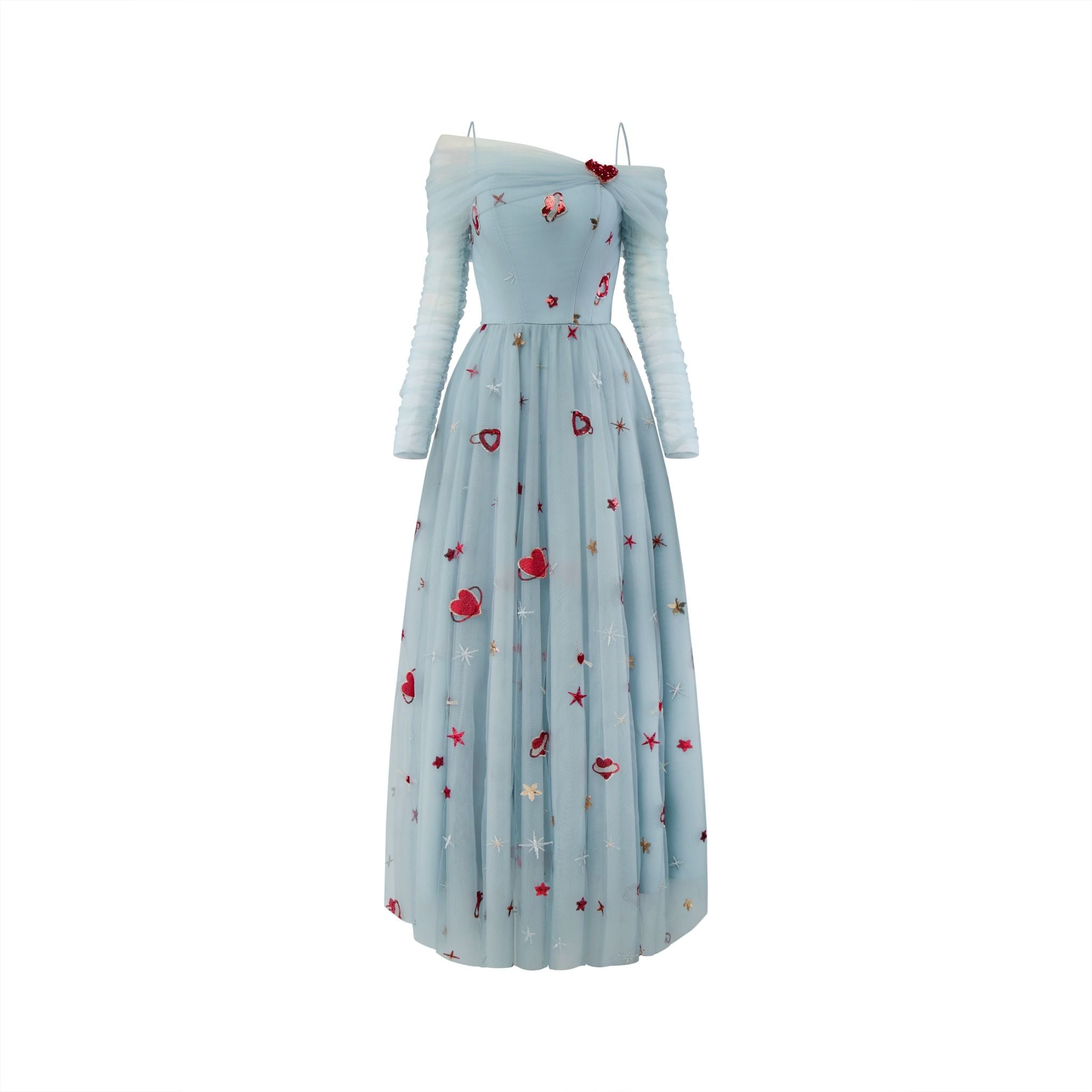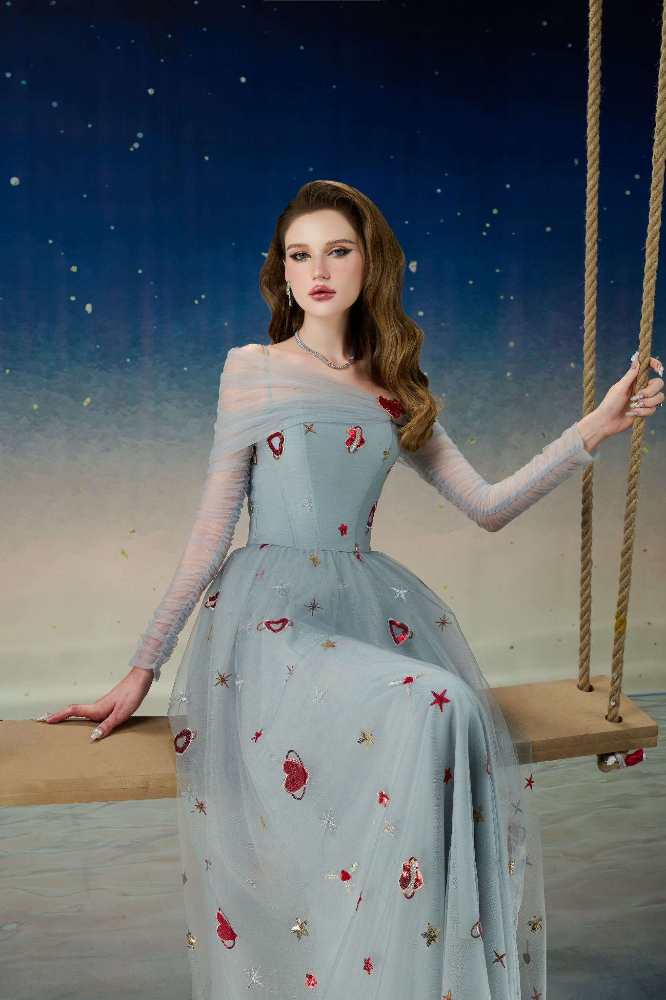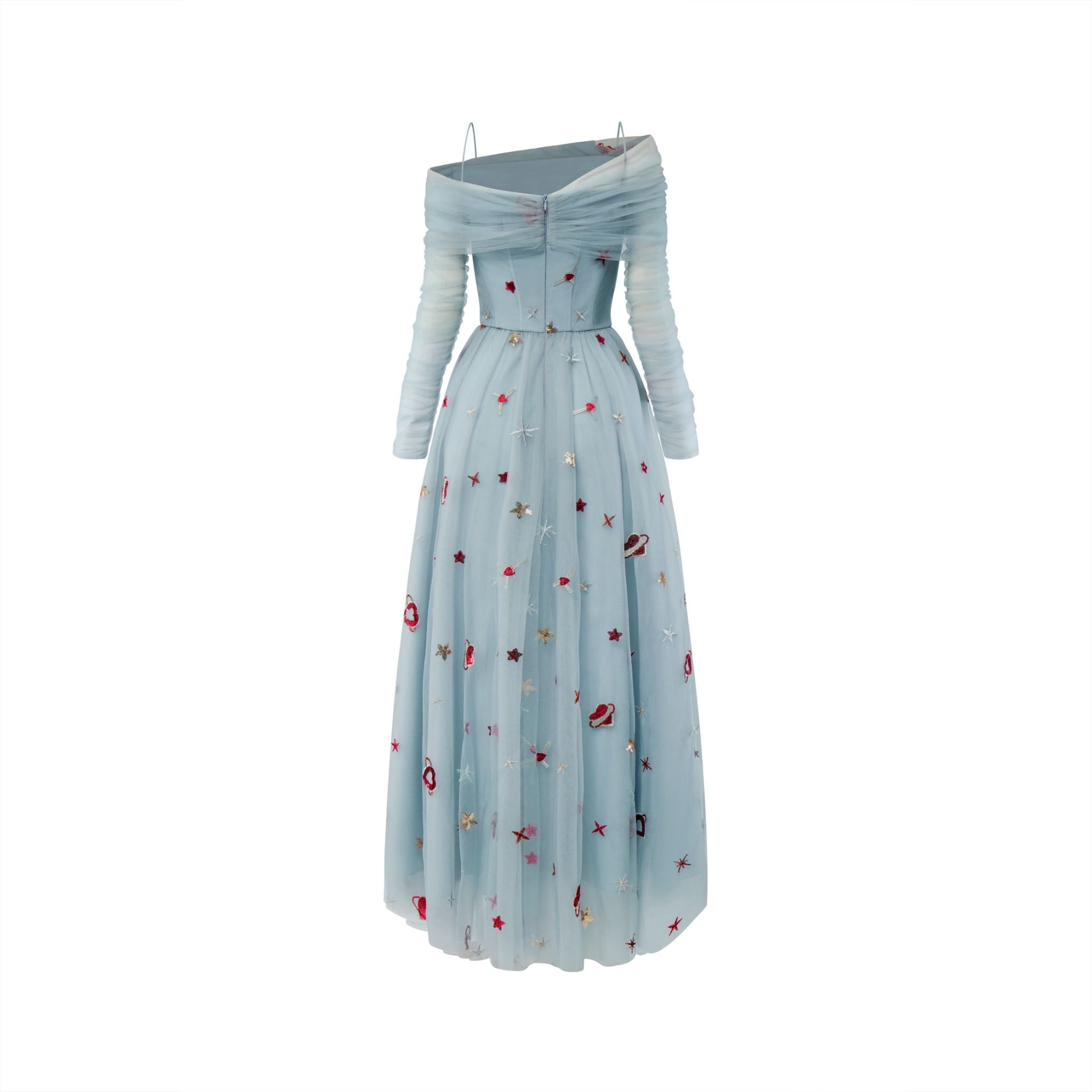 Lưới họa tiết được đính kết tỉ mỉ tạo sự mềm mại và bắt form. Details được đính kết thủ công. Chi tiết vai ngang khéo léo khoe trọn bờ vai quyến rũ